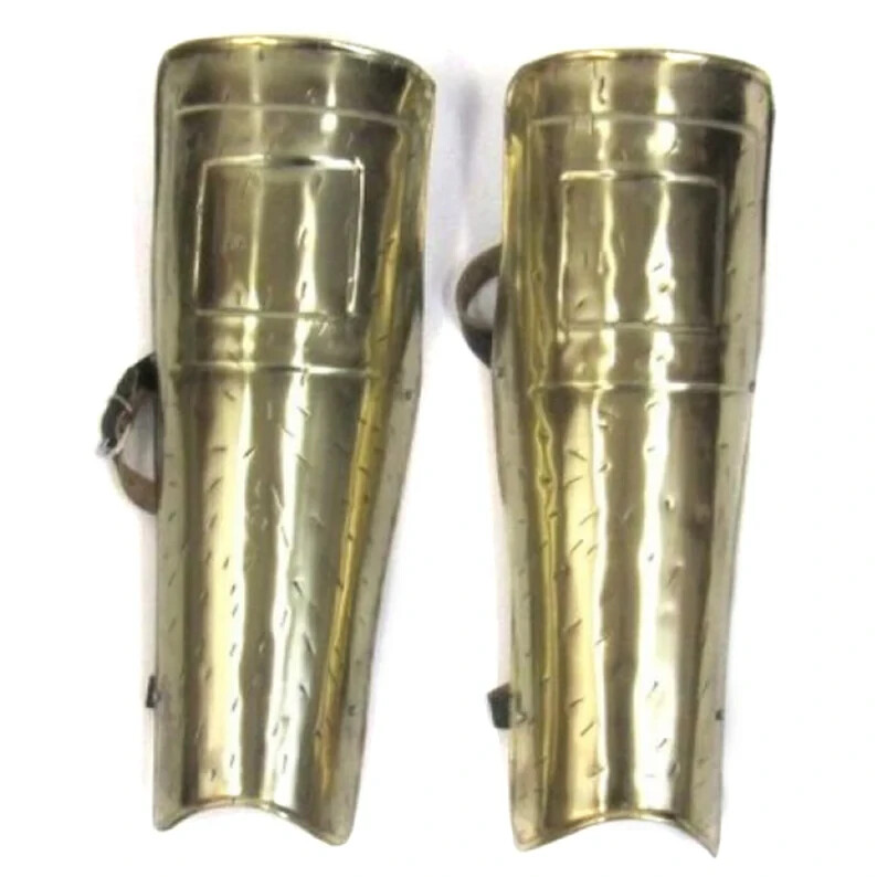The Spartan Greaves Set is sure to provide excellent protection and will compliment a medieval ensemble nicely. This armor was worn by the powerful Spartan army in combat. Featuring solid brass construction, these pieces are authentically designed with metal stays and leather ties for a comfortable fit. Great for SCA combat, costumes, and reenactments. Specifications: -Features solid brass construction -Has metal stays and leather ties -Fully wearable -Great for costumes / collections / role-playing -Dimensions: 19.75"L X 6"W X 5"H -Weight: 4.4lbs