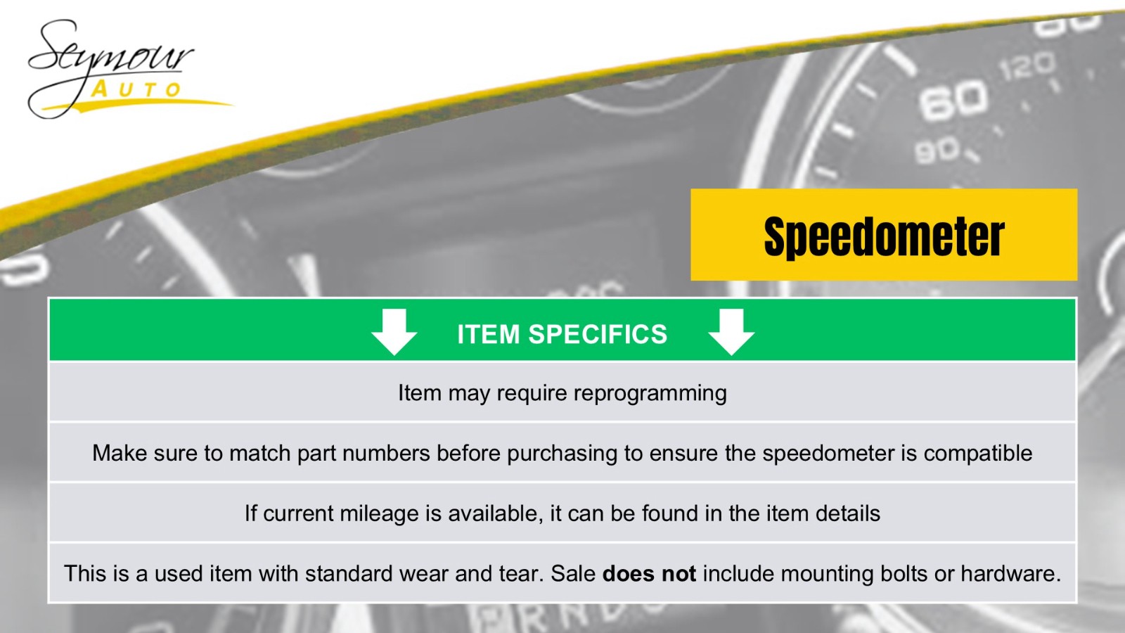 Hollander Welcome to our eBay store! Speedometer Cluster US Market 6 Cylinder LX Fits 05-06 SPORTAGE 1294752 Description Donor Vehicle Model : SPORTAGE Year : 2006 Mileage : 0 (0 = not available or unknown) Stock Number : 030753 Notes : This Part Will Fit These Makes And Models With These Options SPORTAGE 05-06 (cluster), US market, 2.7L (6 cylinder), LX About Us Payment Shipping Returns Warranty About Us We are a locally owned business with over 70 years of experience in the automotive industry with an extensive collection of used car parts and accessories for thousands of different vehicles. Our knowledgeable and caring staff work hard every day making sure all of our parts are high quality and functional to fit your needs. We are happy to verify fitment for you prior to purchase via your vehicle’s VIN (Vehicle Identification Number). Please contact us with any questions prior to purchasing. Orders are sent to the shipping department throughout the day therefore we cannot guarantee adjustments to orders after payment is received. Payment Payment details: Please contact us with any questions prior to purchasing. Orders are sent to the shipping department throughout the day therefore we cannot guarantee adjustments to orders after payment is received. All orders must be paid in full prior to shipment. Payments are processed through eBay by eBay. If payment is not received within a reasonable time from when the order is placed, it will be cancelled without notice. All purchase prices are final. No price match or discount can be made while an item is awaiting payment. Shipping Shipping Details: FREIGHTED ITEMS MUST BE SHIPPED TO A COMMERCIAL ADDRESS WITH A LOADING DOCK AND A FORKLIFT, ABLE TO REMOVE THE PALLET FROM THE TRUCK. WE ALSO COULD FREIGHT TO A LOCAL FREIGHT TERMINAL. PLEASE CONTACT US FOR RATES ON FREIGHTED ITEMS. Items are shipped after being paid in full. We only ship to US addresses within the continental 48 states. Shipping to AK, HI and PO Box's require a special rate and are subject to additonal charges. All parts listed with Free Shipping have a one day handling time and may not be picked up by the carrier the same day the part is ordered. Any estimated delivery dates provided are only estimates and are not guaranteed to be accurate. We are not responsible for any delays with UPS, Fed-Ex or USPS. We must be contacted same day if an item is received damaged. All address changes must be completed before the part is shipped. Address changes that take place after the part has been shipped are subject to an address change fee. Overnight and expedited shipping options are available for an additional cost. All parts listed as, Pick Up Only , can be shipped if the shipping cost is covered by the buyer. All parts listed as, Pick Up Only , will be held at Seymour Auto Wrecking (107 New Haven Rd, Seymour CT 06483) for the buyer. International orders are shipped via eBay’s Global Shipping Program. We are not responsible for any shipping charge associated with eBay's Global Shipping Program. We are unable to change the delivery address on all orders shipped through eBay's Global Shipping Program. eBay must be contacted directly. We are not responsible for any delays or issues reagrding any item purchased and shipped through eBay's Global Shipping Program. Returns All parts sold have a standard 30-Day return window. Return Details: We must be contacted within 30 days of the carrier provided delivery date for the return to be accepted. No return wil be accepted if contacted after 30 days from the carrier provided delivery date. We may require more information reagrding a return request. ex: pictures, receipts, videos, etc. A free return label will not be provided for remorse return reasons. ex: changed mind, ordered by mistake/by accident, didn't like it The buyer must ship the return within 21 days of receiving a return label or starting a return. All returns must be sent in the appropriote sized box with adequate packaging. Any return received damaged may be eligible for a refund deduction. All returns made must be occompanied with a return reason. All returns that are received without a reason will not be processed. If a return label is issued by eBay, we are not responsible for reimbursing the buyer for the cost of the label. In the event the part returned does not match the original part sent, a case will be opened up with eBay. Warranty All parts come with our standard 6-month warranty. Please contact us for more details prior to ordering. The warranty begins as soon as the buyer takes possession of the part. Standard 6-Month Warranty: If a part is proven to be defective within the 6 month warranty period, a replacement or refund will be sent at our discretion. We are not responsible or liable for any incidental or consequential loss or damage. We will require more information reagrding a warranty request. ex: pictures, receipts, videos, etc. No warranty claims or reimbursement on labor. All body parts are sold as is. Any part that is damaged or altered by the buyer will not be eligible for warranty or return. No warranty claim can be made based on color or trim package. We are not responsible for the buyer's error. ex: Accidental orders, late address changes. We do not offer an extended warranty with eBay. If you experience any issue with your part, please contact us prior to attempting to repair or remove the part. Failure to do so will void the warranty. We make no claim as to the suitability of any part for any particular purpose. The buyer is responsible for determining the suitability of the part purchased for its intended purpose. In the event an incorrect part is shipped, please contact us immediatley so an exchange can be processed. Copyright © 2022, All Rights Reserved. Template Design & Developed By: Copyright © 2022, All rights reserved. Design & Developed By : eFusionWorld