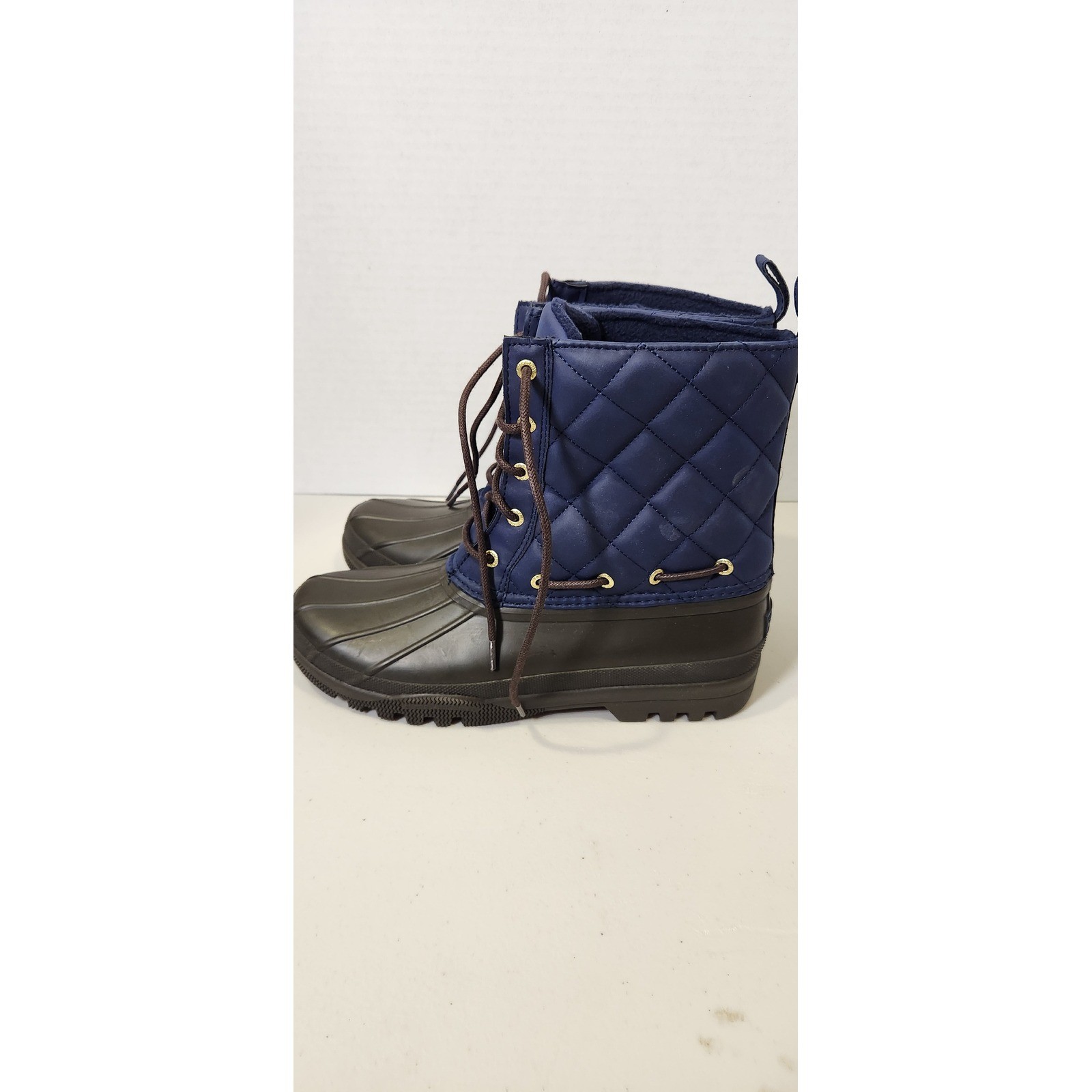 Excellent condition, with box, Sperry Topsider Gosling Waterproof rubber boots. Size 8, navy blue upper, brown bottom.