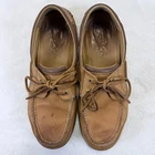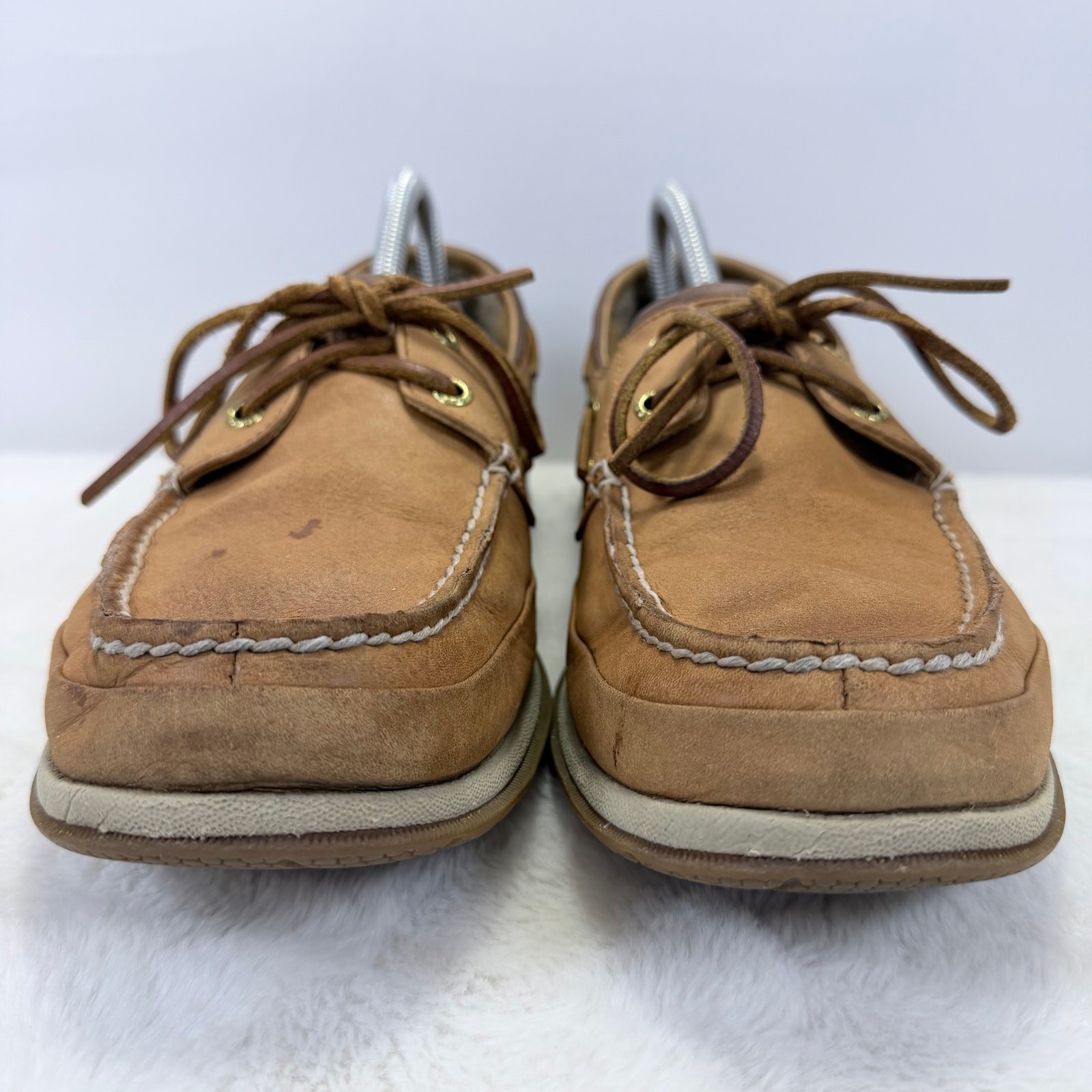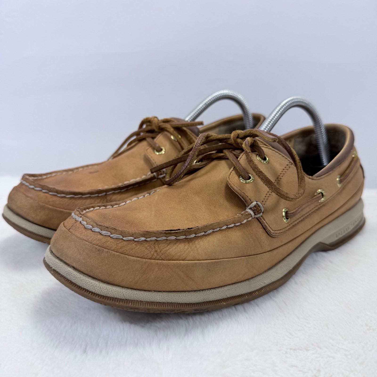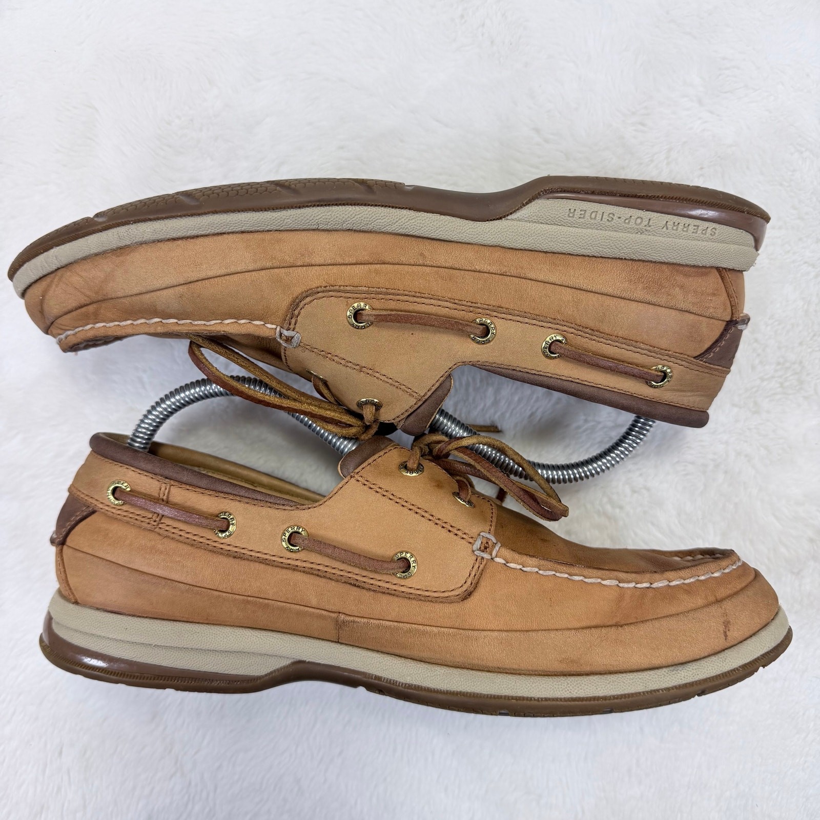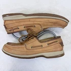 Sperry Top-Sider Billfish 3-Eye boat shoes in tan leather, men’s US size 10. Classic moc-toe boat shoe design with full-grain leather, 360° lacing system, and non-marking rubber outsole for grip on wet and dry surfaces — perfect for casual everyday wear, summer outfits, or nautical style. Shoes are Pre-Owned and show normal signs of prior use such as light creasing, minor scuffs, or outsole wear. Please review all photos carefully to assess condition and details before purchasing. Returns: Returns accepted. If a return is requested due to change of mind, fit, or any reason not related to an item being not as described or seller error, the buyer is responsible for return shipping costs.