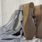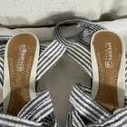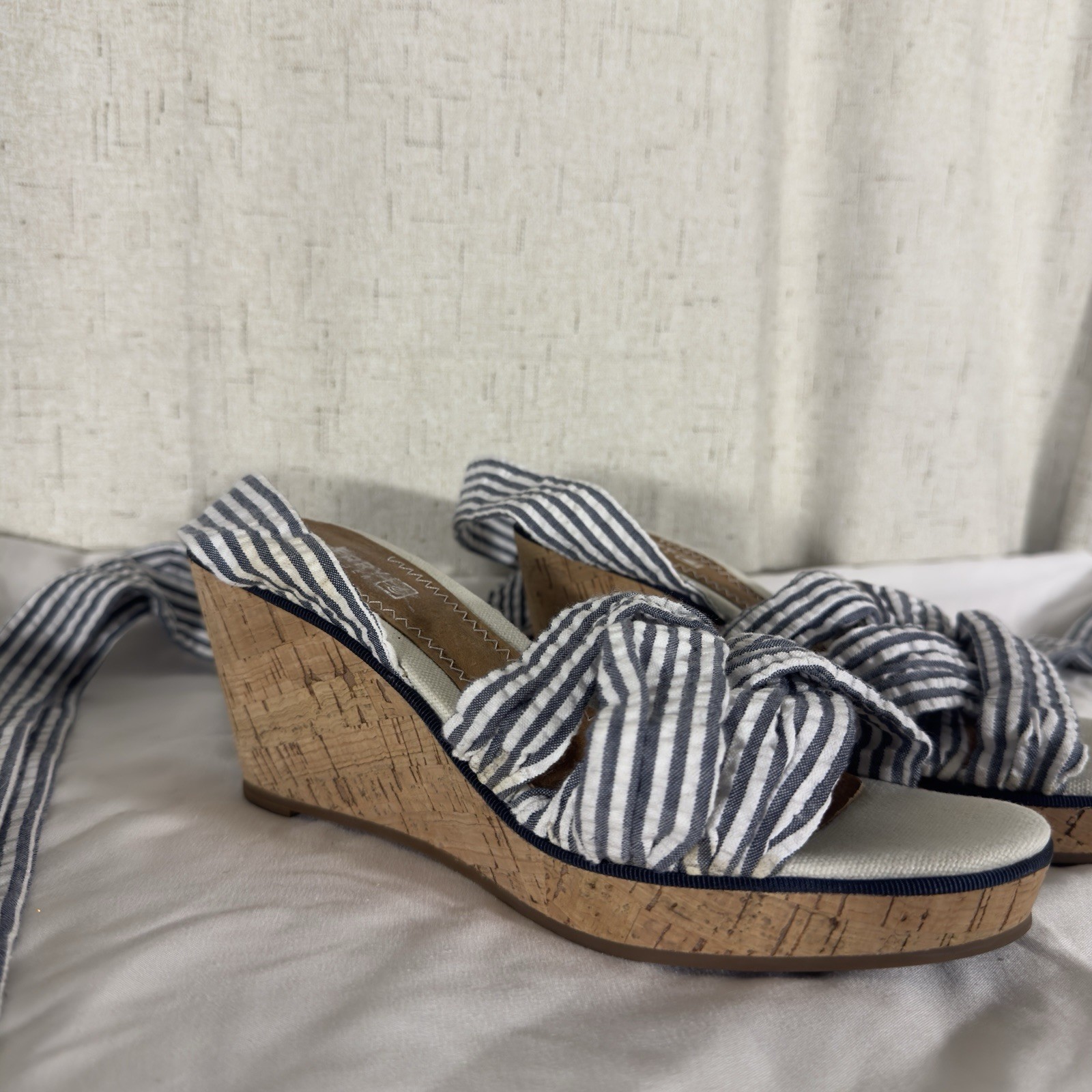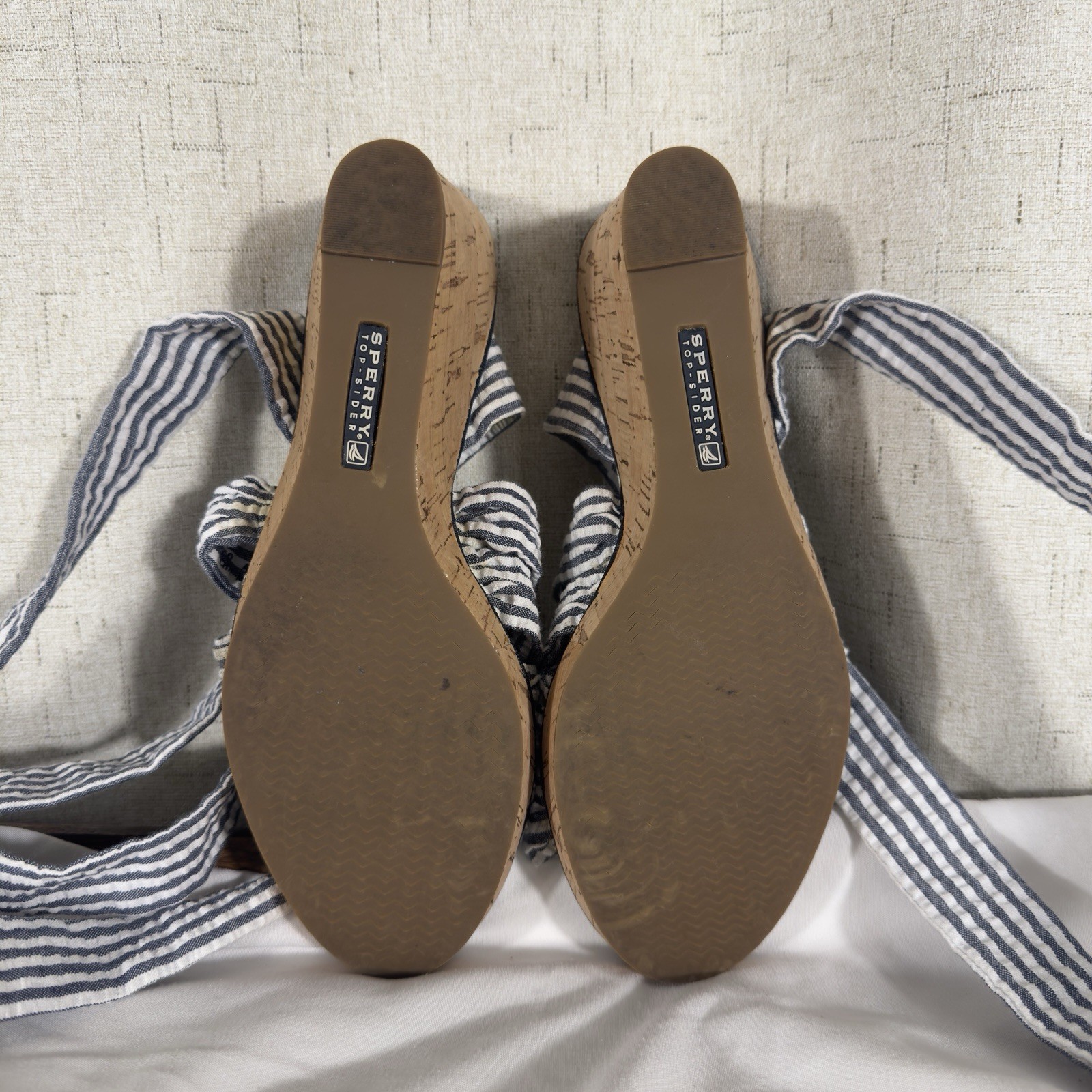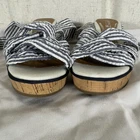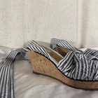 Step into nautical-inspired style with these Sperry Top-Sider Seersucker Cork Wedge Sandals. Featuring a classic blue-and-white striped fabric upper with playful ankle ties and a natural cork wedge heel, these shoes are perfect for coastal summer style. Details: • Brand: Sperry Top-Sider • Size: Women’s 5 • Color: Blue & White • Pattern: Seersucker Stripes • Upper Material: Fabric • Lining: Textile • Outsole: Rubber • Heel Type: Cork Wedge • Heel Height: Approx. 3.5 in • Platform Height: Approx. 1 in • Style: Ankle Tie Wedge Sandals • Features: Knotted Front, Wraparound Ankle Straps, Cushioned Insole, Slip-Resistant Sole • Condition: Pre-owned, great overall condition. Minor discoloration on fabric straps and trim (shown in photos) — not very noticeable when worn. Clean and sturdy cork wedge, ready to wear. Ships fast — same or next business day!