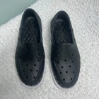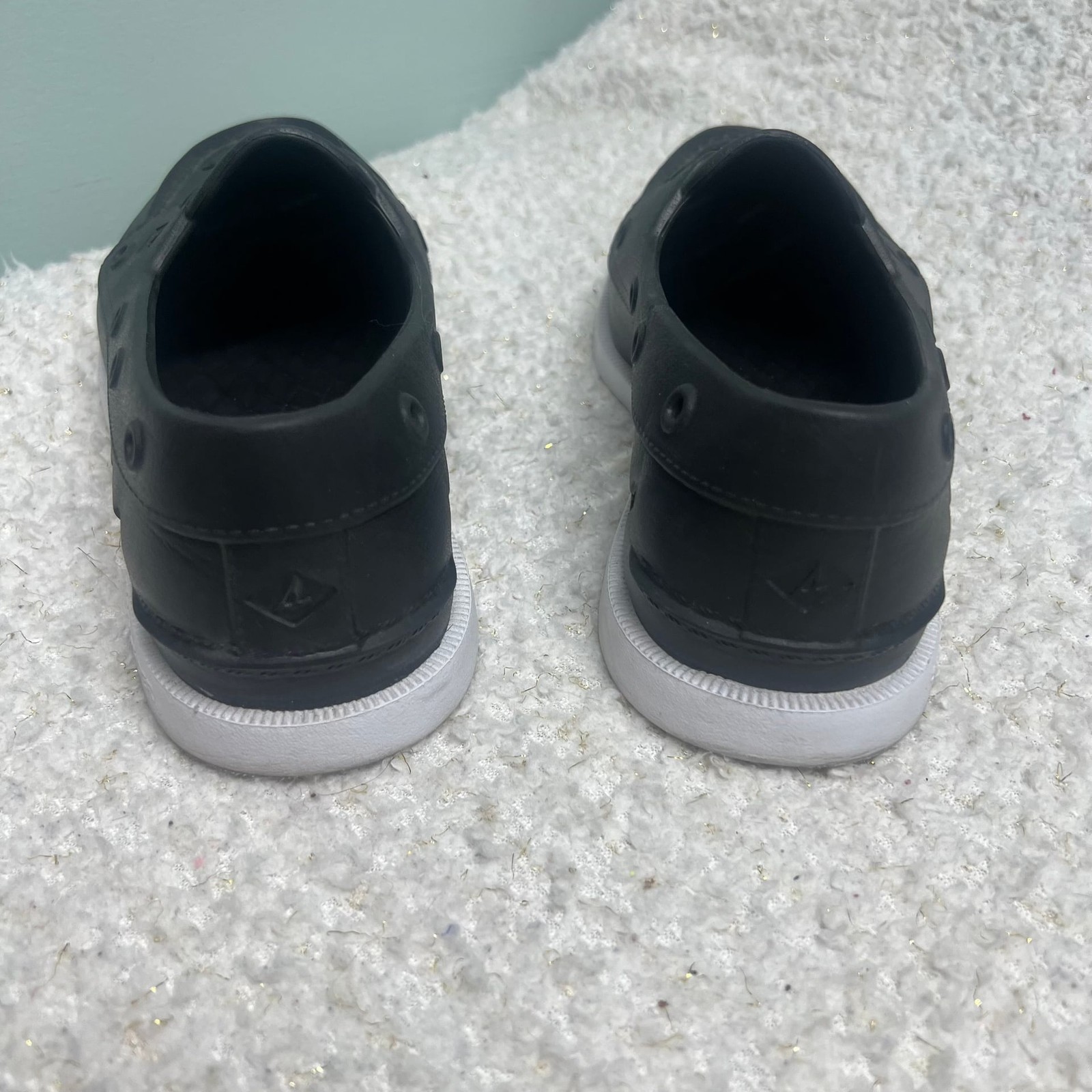 Sperry Authentic Original Float Boat Shoes in black, MENS Size 5, WOMENS Size 7 These lightweight, water-friendly shoes feature a breathable EVA upper with drainage port holes and a non-marking rubber outsole with molded Wave-Siping for ultimate traction on wet or dry surfaces. They offer a classic boat shoe silhouette with a modern, easy-to-clean design. Excellent pre-owned condition with very light wear on the soles as shown. Perfect for the beach, boat, or casual summer wear.