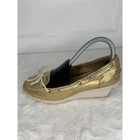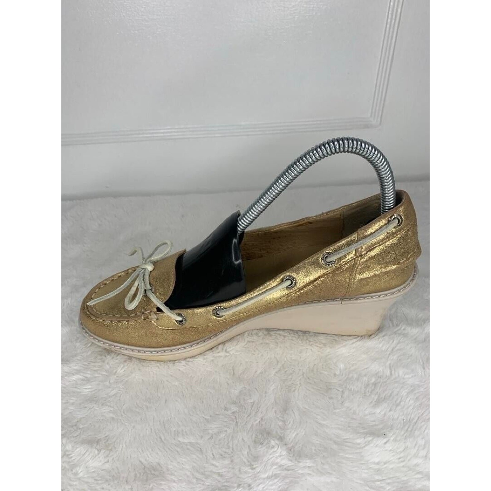 These Sperry women's boat shoes in size 7.5 offer a chic metallic gold finish, blending elegance with functionality. Designed with a wedge heel, they provide subtle height while maintaining comfort. Their classic boat shoe silhouette, complete with lace detailing, ensures a timeless look, making them a versatile addition to any wardrobe. • Wedge heel for added height • Classic lace-up design • Slip-on style with ease • Durable construction Sole shows minor wear. Top to bottom = 3 inches.
