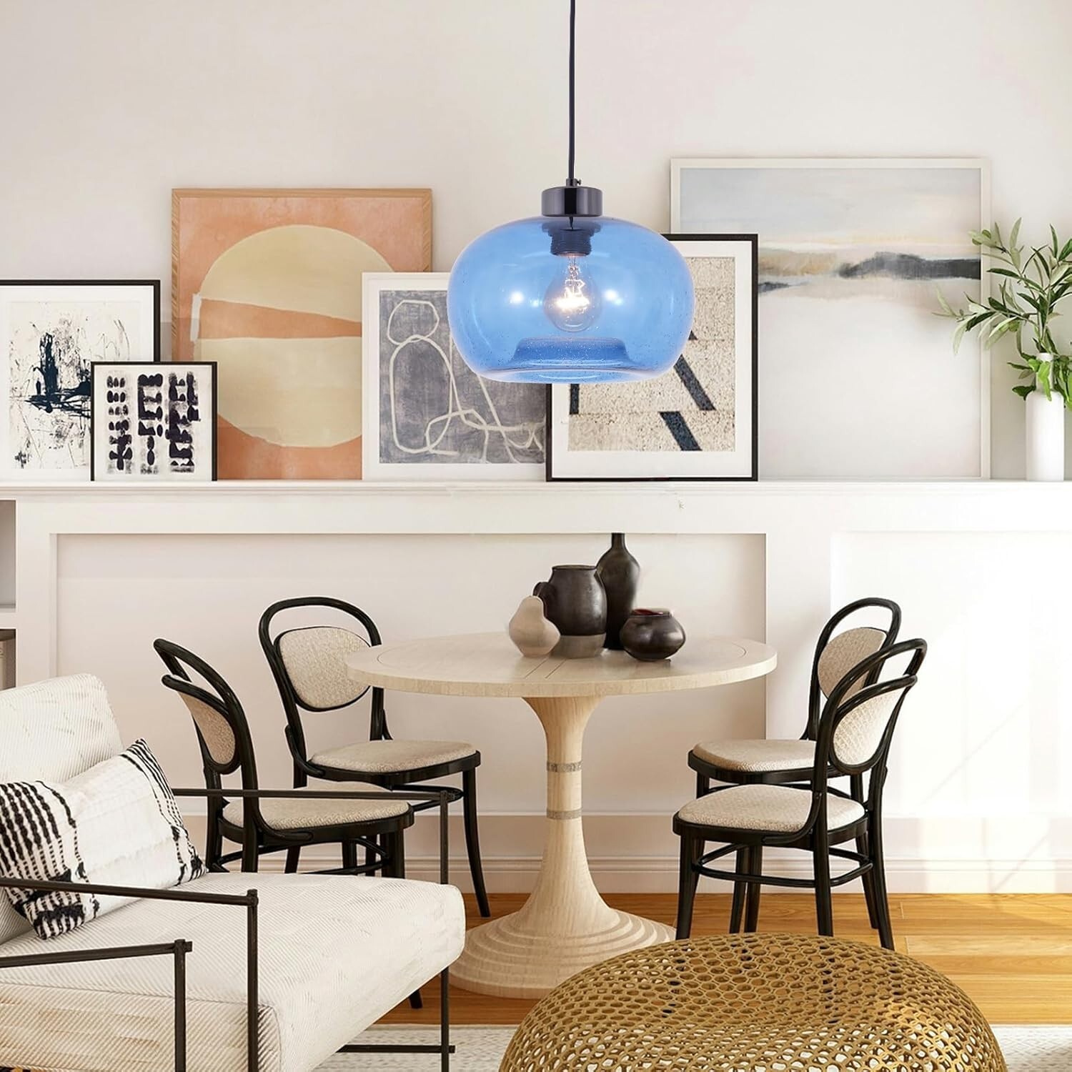 About this item 【Handcrafted Blue Bubble Glass Pendant Light】Elevate your space with our stunning Blue Bubble Glass Pendant Light, meticulously crafted by skilled artisans with over 30 years of experience in glass artistry. Each shade is uniquely hand-blown, resulting in subtle variations in bubble patterns that add character and charm. The modern design complements any room, making it a perfect centerpiece for your kitchen island, dining area, breakfast nook, or living room. 【Effortless Installation & Customizable Height】Designed for convenience, this pendant light features an adjustable cord (57 inches long) that allows you to customize the height to suit your space. The standard E26 socket ensures easy installation, making it a hassle-free addition to your home. Whether you’re illuminating a high ceiling or a cozy corner, this fixture adapts seamlessly to your needs. 【Versatile Compatibility & Durable Construction】Compatible with E26 bulbs (not included), this pendant light is crafted from high-quality glass and metal for lasting durability. It supports a wide voltage range of AC 110V-220V, making it suitable for both residential and commercial use. Pair it with warm white or daylight bulbs to create the perfect ambiance for any setting. 【Focused Lighting for a Welcoming Atmosphere】Transform your space with focused, warm illumination that enhances the ambiance of your kitchen, dining room, or bar area. The soft, diffused light creates an inviting environment, perfect for cooking, entertaining, or relaxing. Whether you’re hosting a dinner party or enjoying a quiet evening, this pendant light sets the mood effortlessly. 【Modern Industrial Design for Every Space】Combining handcrafted blue bubble glass with a sleek matte black metal finish, this pendant light blends modern elegance with industrial charm. Its versatile design suits a variety of settings, including kitchens, bathrooms, bedrooms, restaurants, and cafes. Add a touch of contemporary style to your home or workspace with this eye-catching lighting fixture .