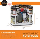 DUAL SPIN LAZY SUSAN – Built-in turntables keep all your spices at your fingertips with a simple spin. Makes everything visible and provides storage for taller items. Reclaim unused space in your cabinets and keep everything in view! D SHAPED DESIGN – Turn any mess into a customized masterpiece! Uniquely constructed to save space by fitting flush against any cabinet or cupboard to hold up to 40 spices and condiments. Spins to bring spices closer to you. ADJUSTABLE HEIGHTS – You can customize the storage capacity of your pantry, cabinet or fridge as well as adjust to fit your cabinet. Allows you to easily store smaller and larger spices and more! Two levels ensure maximum storage. USE IT ANYWHERE – Stack cans and bottles in your fridge, reclaim your bathroom counter space and organize your medications and toiletries, or make craft tables neat and always ready for creative minds. SAVES SPACE – Depth 10.75”, width 13” to fit most cabinets and cupboards Spice Spinner is the adjustable two-tiered spice organizer/rack that stores and stacks all your spices, so you can save space and keep everything neatly in place! With its unique D-shaped design, Spice Spinner fits flush against any cabinet, fridge, or pantry! But with a simple spin, the spices come closer to you for an even better view. Maximum Total Weight Capacity 15lbs, Upper Level Platform 5lb capacity. Overloading the Upper Level Platform may cause the Spice Spinner to tip and/or damage the unit.