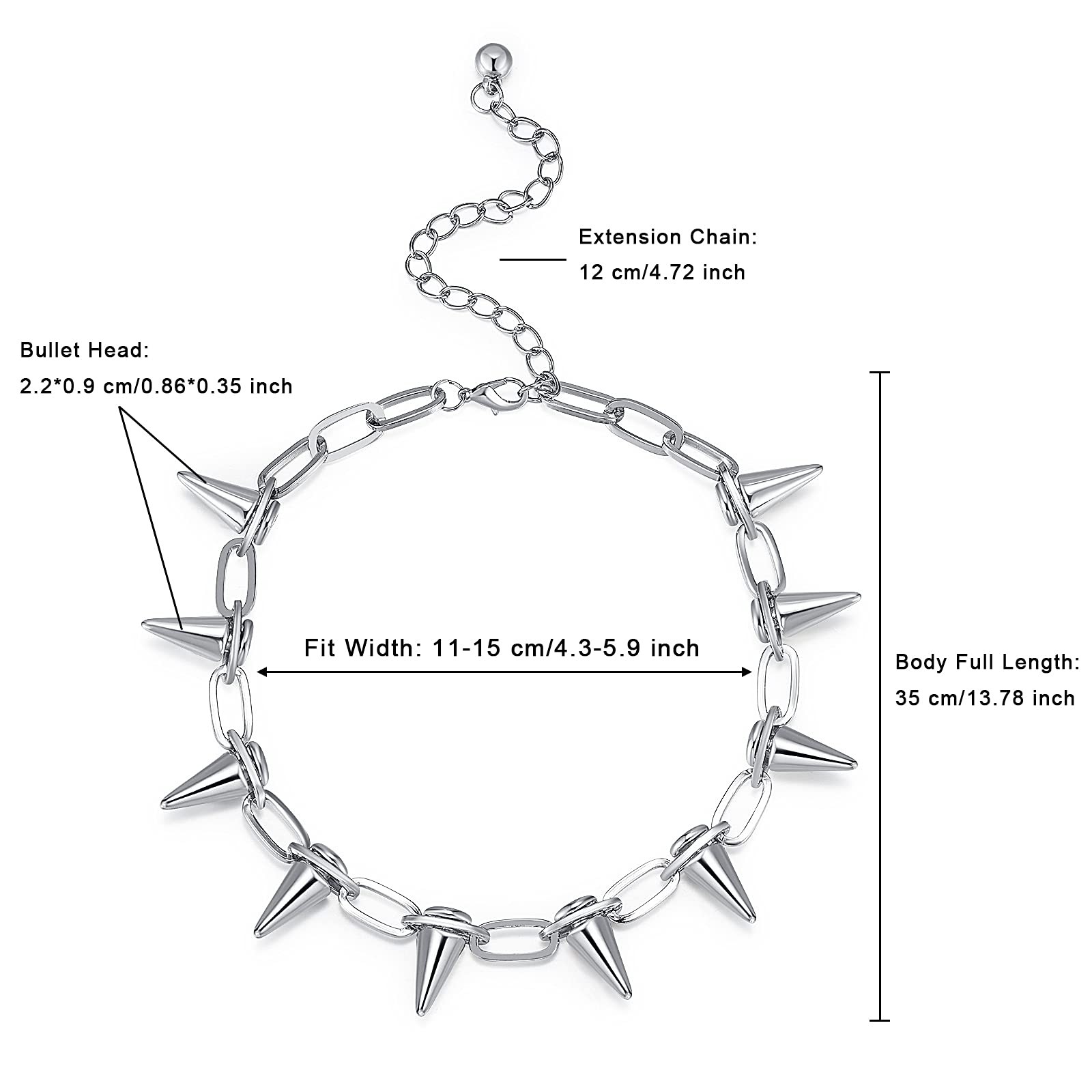 Spike Necklace Choker Rivet Goth Necklaces Chokers with Spikes Silver Spike Necklace for Women - Full length: 35 cm/13.78 inch, Extension chain: 12 cm /4.72 inch, Fit width: 11-15 cm/4.3-5.9 inch, Rivet size: 2.2*0.9 cm/0.86*0.35 inch. One spike choker necklace studded with 10 rivets. Easy to put on and off. Material of Spike Chain Choker - High quality alloy, The surface of spiked necklace is electroplated, Exquisite workmanship, Good color retention, Not easy to fade. Which is friendly to the skin. Streetwear punk choker necklace suit for women and men. Goth Necklaces - Unique rock gothic choker necklace have extender chain, One size fit all, This chokers with spikes and chain can be used as necklace or a decorative jewelry chain on jeans or boots. Perfect Gift - Rivet choker necklace will be the best gift for your wife, friends, family, parents. Suitable for beach, birthday, anniversary, holidays, graduation, Christmas and any other occasion. Suitable Occasions - Wearing it you will show outstanding and get more compliments at costume parties, Halloween parties, Gothic fan parties, rock concerts, Cosplay, and bachelor parties. Spike Necklace Spike Choker Rivet Goth Necklaces Chokers with Spikes and Chain Streetwear Vintage Punk Necklace for Women Men Choker Size: Full Length: 35 +12 cm /13.78 + 4.72 inch Fit Width: 11-15 cm/4.3-5.9 inch Rivet Size: 2.2*0.9 cm/0.86*0.35 inch Specification: Type: Choker Spike Necklaces Gender: Women, Ladies, Men Package Weight: About 35g Color: Black, Gold, Silver Material: Punk spike choker necklace is made of high-grade alloy with tin-free plating that does not get dented and scratched easily. Each of the rivet is so tight that it's not easy to break. Don't worry about falling off. Adjustable: This Spike Necklace comes with an adjustable extension chain, One size fit all, Easy to put on and take off. The streetwear punk choker necklace can be paired with almost any outfit such as jeans, shirts, dress and boots etc. Occasions: This rivet choker necklace will be a perfect gift for your wife, husband, parents, friends, family and so on. Handmade adjustable spiked necklaces are suitable for Christmas, birthday, valentine, mother’s day, wedding, party or daily wear. Service: We always provide customers with high-quality products and the best service. If you have any questions about the product, Please feel free to contact us via email and we will reply you within 24 hours. Shipping We offer FREE shipping on all orders! We ship within Three business days of payment, usually sooner. We use a selection of shipping services such as UPS, FedEx, USPS etc. We only ship to the lower 48 states, no APO/FPO addresses or PO Boxes allowed. Local pickups and combined shipping options are not provided at this time. Return You can return a product for up to 30 days from the date you purchased it. Any product you return must be in the same condition you received it and in the original packaging. Please keep the receipt. Payment We accept payment by any of the following methods: PayPal Please pay as soon as possible after winning an auction, as that will allow us to post your item to you sooner! Feedback Customer satisfaction is very important to us. If you have any problem with your order, please contact us and we will do our best to make you satisfied. Contact Us If you have any queries, please contact us via ebay. We usually respond within 24 hours on weekdays. Please visit our eBay store to check out other items for sale! Thank you for shopping at our store.