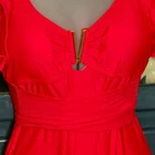 This swimsuit features a vibrant red hue with a sophisticated V-neckline and elegant ruffle sleeves. A stylish cut-out back design is tied with a bow, adding a touch of flair. Suitable for beach outings and poolside relaxation, it offers a blend of comfort and style. • V-neckline with gold accent • Ruffle sleeves • Cut-out back with tie closure • Stretchy and comfortable fit Features: • Gold Metal V Accent • Tummy Tuck Swimsuit • Figure Flattering • Lined, Built in Bra w/ Removable Cups Size: Womens Large Measurements: Across Chest 16 in / 41 cm Across Waist 15 in / 38 cm Across Hips 17 in / 43 cm Total Length 28 in / 71 cm Condition: New With Tags NWT No Smoking Workspace Please review all photos closely before purchase, buy responsibly, thank you. Please read the description for further details and measurements, Thank you!