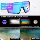 Description UV protection polarized sports sunglasses for men women youth kids; đ´âď¸ăShield Shaped Lenses for Different Face Shapesă This polarized sunglasses adopts a shield-shaped structure, with a technological design that can fit different face shapes and block a large area of strong light and UV rays for you.Its TAC lenses are made of high-quality materials, which are impact resistant, scratch resistant, durable, and not easily broken, effectively helping you block flying objects. đ´âď¸ăUV Protection HD Polarized Lensă This bike & baseball glasses uses high-definition TAC lenses.The polarization lenses can filter reflective light,especially the reflective light on the water surface,while blocking the glare caused by scattering,refraction and reflection.The high-quality UV coating can filter out 100% UVA, UVB, UVC rays and harmful blue light,blocking strong light.The HD lenses retain a high perspective rate,restore true colors and make your outdoor view more comfortable. đ´âď¸ăLightweight and Durable TR90 Frameă This sport sun glasses uses a high-strength and tough TR90 frame, with excellent compressive performance that allows you to face various challenges.It is equipped with high-quality anti-slip rubber legs and nose pads that can be installed with myopia frame, and has a comfortable ergonomic design that can fit snugly to your head without putting pressure on your nose. đ´âď¸ăVarious Protective Accessoriesă This blue lens sunglasses comes with a lens cloth for easy cleaning and wiping, an ultra-fine fiber material glasses bag to prevent scratches and can also be used as a cloth. Additionally, it is equipped with a polarization test card to verify performance and a durable eyeglass case for easy carrying. đ´âď¸ăVersatile Occasionsă This shield-shaped sunglasses have been commonly used in activities such as baseball, softball, cycling, fishing, golf and boating, and are also suitable for more outdoor sports such as motorcycles, running, skiing, volleyball, tennis, driving, Ironman triathlon, racing, mountain tourism, hiking, hunting, and golfing.