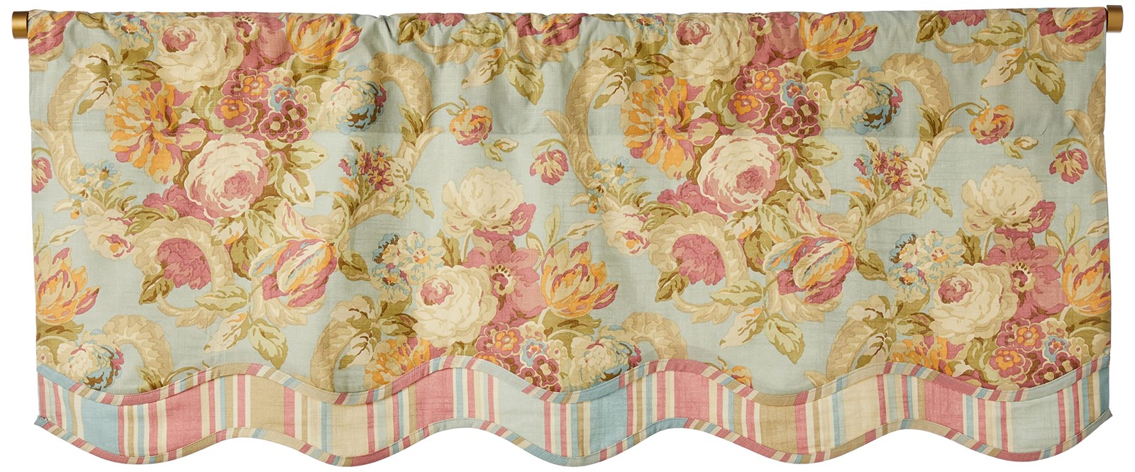 STYLISH WINDOW VALANCE - Add style and function to windows in your bedroom or living room. Valance offers enhanced privacy and light control. Sold as a single panel, measuring 52” x 18” with a rod pocket that fits up to a 2” rod BEAUTIFUL DESIGN - Bring classic elegance into any room of your home with the Spring Bling collection. This window valance features a traditional floral with scroll print with a coordinating stripe trim, where high fashion design meets chic sophistication MATCHING SET - Complete the look by layering coordinated bedding, accent pillows, and lined window treatments, all finished in Waverly's Spring Bling style CONVENIENT CARE - A 100% cotton, easy-care window treatment that you can put in the washing machine with like colors, do not bleach. Wash in cold water on the gentle cycle and tumble dry on low, warm iron if needed TRUST WAVERLY - A renowned brand synonymous with elegance and quality, Waverly can help you upgrade your space with confidence. Embrace the delightful blend of style and comfort, and make your home a haven of relaxation and indulgence