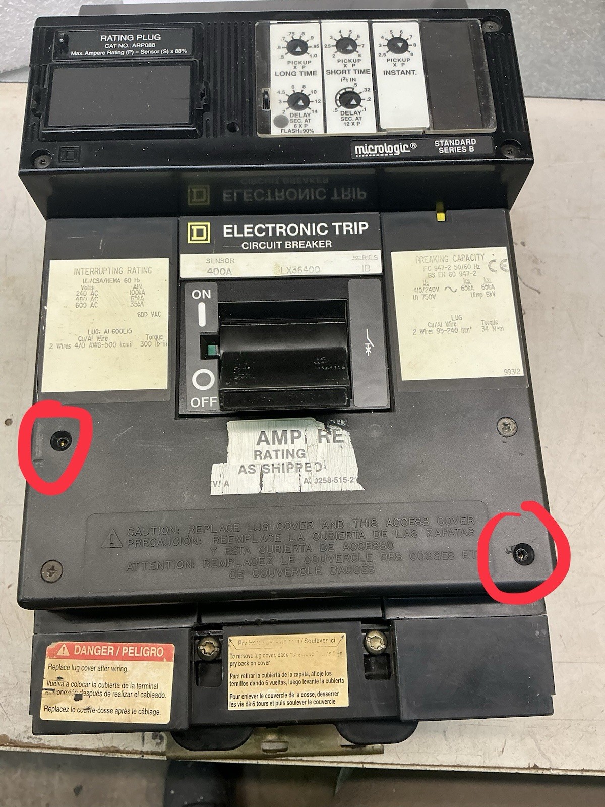 Square D SCHNEIDER ELECTRIC 400A LX36400 CIRCUIT BREAKER W/ ARP088 Rating Plug. Clean. Removed from working panel. Missing 2 screws on cover. Does not affect functionality. See photos.
