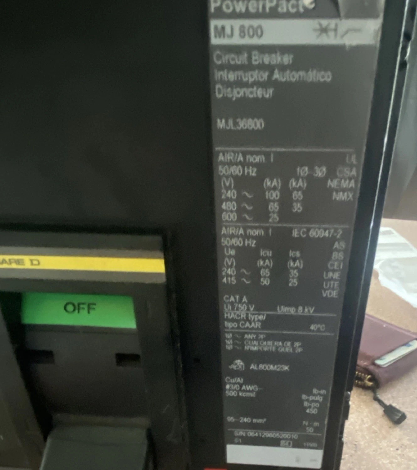 Square D Schneider Electric MJ 800 Circuit Breaker MJL36800 800A 600V 3-Pole