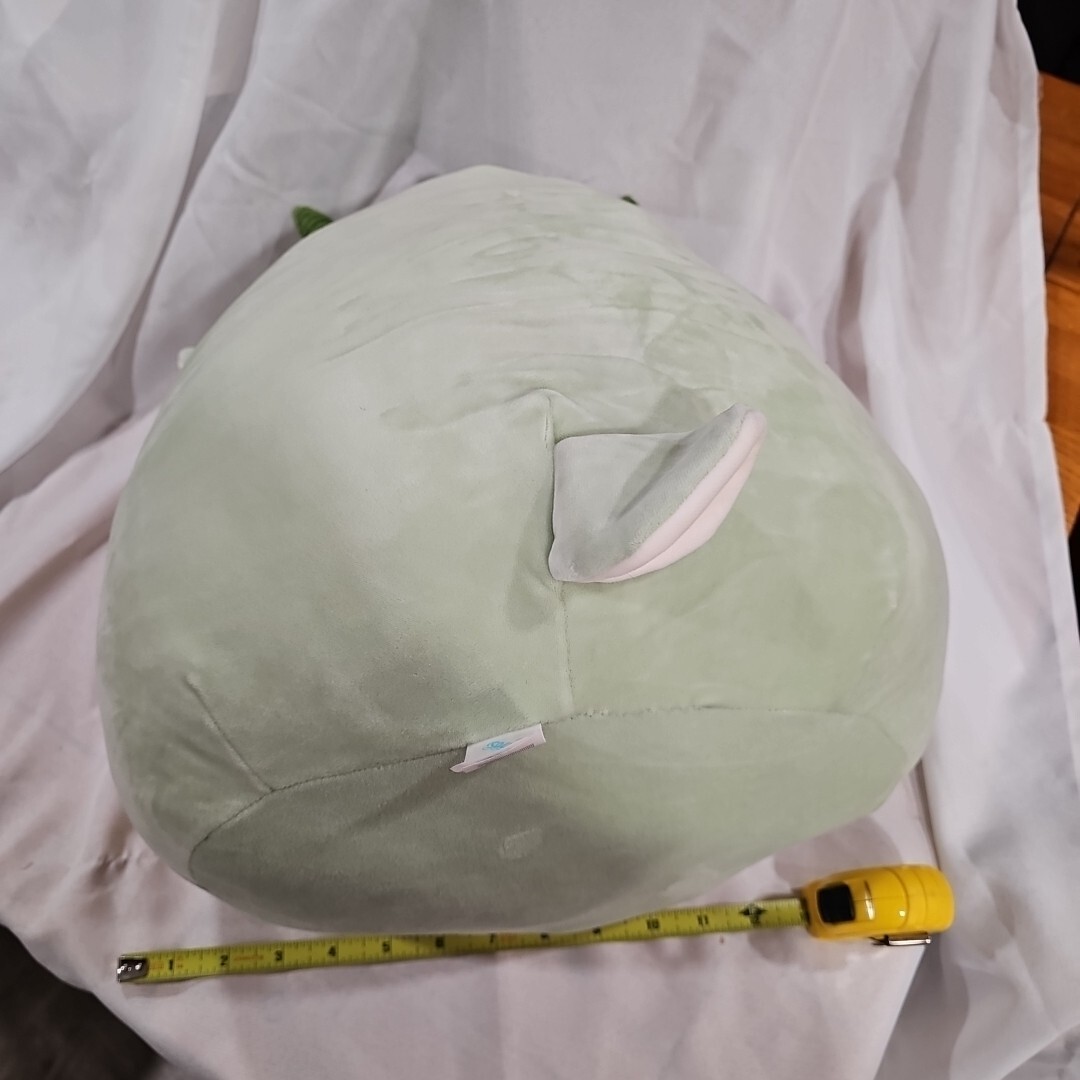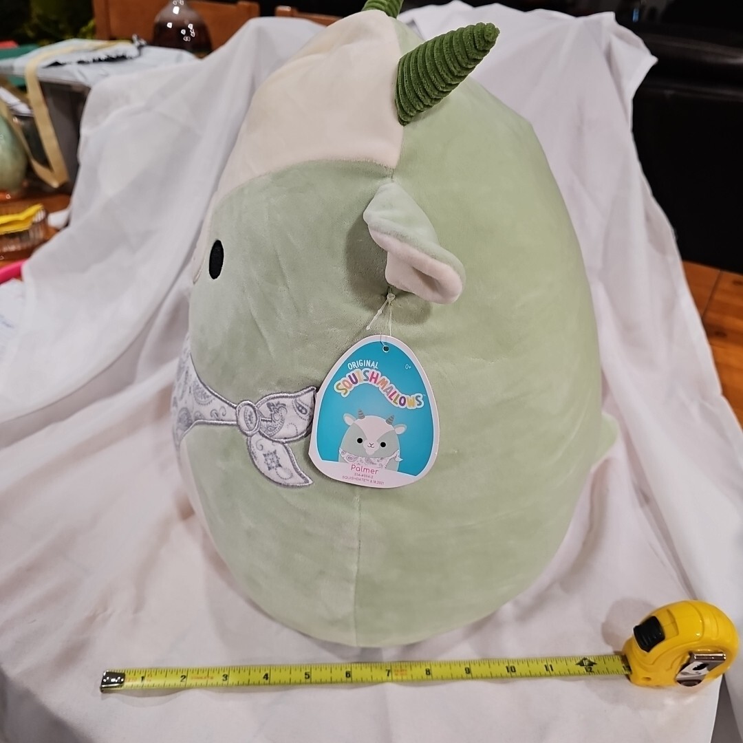 This is a 2021 Squishmallow plush toy of Palmer the Goat, measuring 14 inches. It is green in color and features a removable bandana. Part of the Farm character family, this medium-sized Squishmallow is washable and perfect for cuddling or collecting.