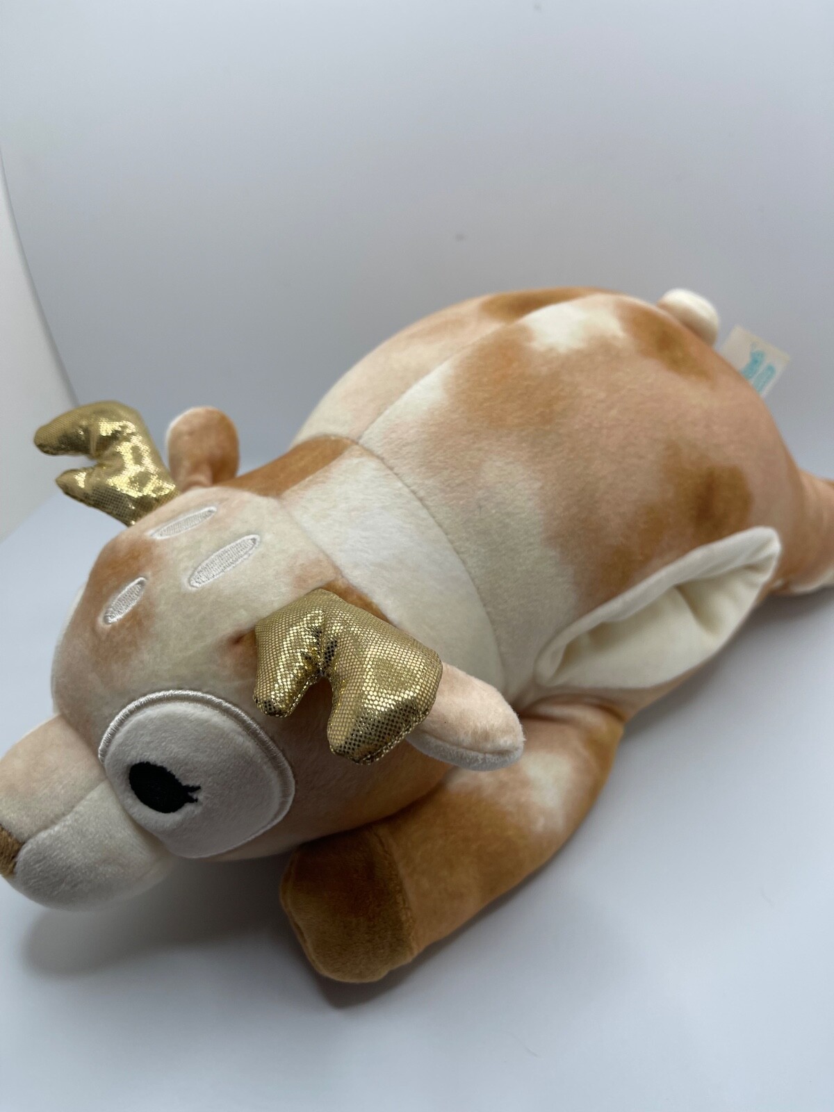 The product is a Squishmallows Hugmallow plush toy featuring Dawn the Deer, with a unique gold sparkles design. This medium-sized (14 inches) stuffed animal is part of the popular Squishmallows brand, known for their soft and huggable toys. Perfect for any occasion, this cute and cuddly deer toy is sure to bring joy to anyone who receives it.