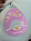 The product is a Squishmallows 16" plush toy featuring Sammy the Seafoam Green Bunny holding a basket. It is a gender-neutral stuffed animal in blue color, measuring 16 inches in height and weighing 2.350 lbs. The dimensions are 15.55 x 9.59 x 18.48 inches, with a length and width of 13 inches each.