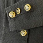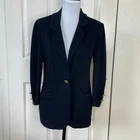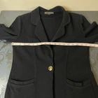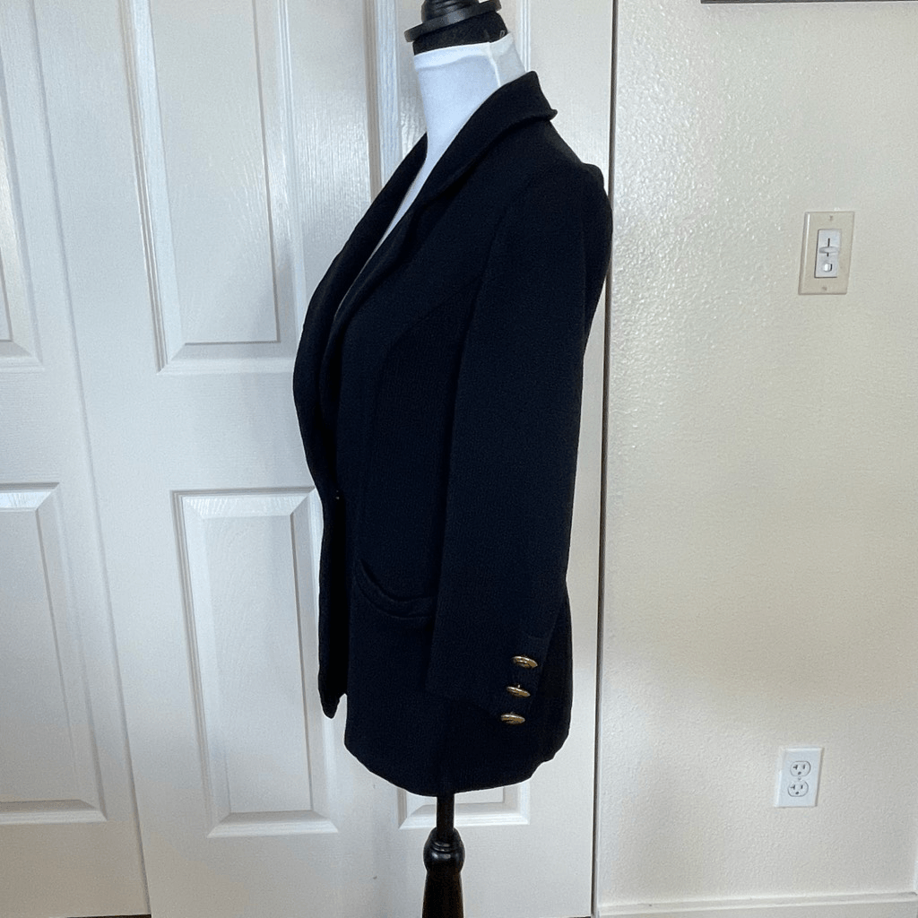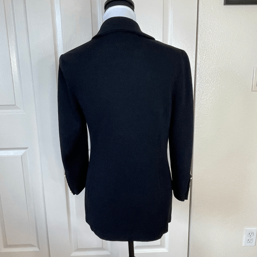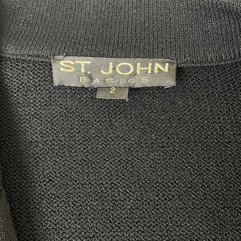 St. John Knit Jacket Black Santana Knit Blazer Coat Button Sleeves Size 2 Approximate measurements while lying flat are Pit to pit: 18” Shoulder to hem: 28.5” Sleeve: 18.5” Material is the Santana knit. There is one small flaw on the lapel as pictured in photos. Not noticeable. Old money, quiet luxury, classic
