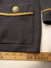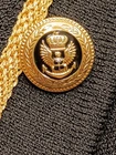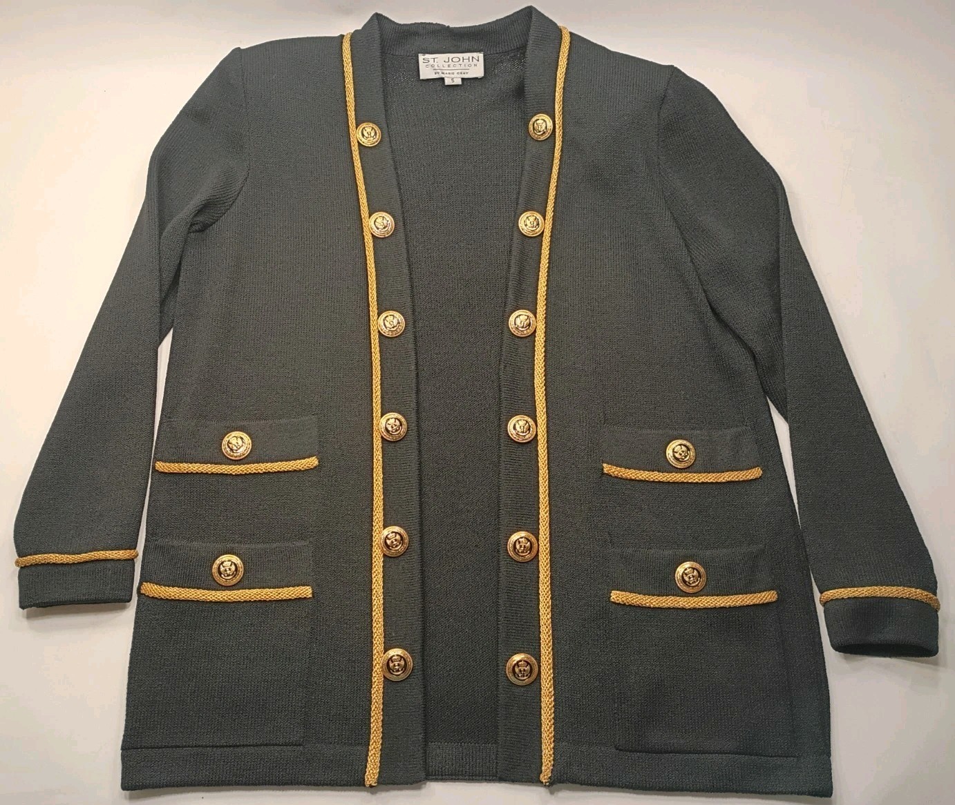 The St. John Marie Gray Collection Black Gold Knit Cardigan is a stylish and sophisticated sweater featuring military-inspired eagle buttons. This vintage piece offers a classic cable-knit design with a solid black and gold color combination, perfect for a nautical or preppy look. The long sleeves, shoulder pads, and open front make it a versatile and comfortable addition to any woman's wardrobe, ideal for layering over ensembles in both casual and formal settings. Made from high-quality knit fabric, this cardigan is a must-have for those who appreciate timeless fashion.