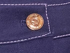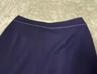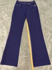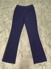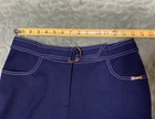 St. John Sport Navy Blue Dress Pants by Marie Gray featuring built in belt with gold clasp and button. —— White seams run down the legs and across the waist. ——- Size 4 ——- 64% Polyester, 33% Viscose, 3% Spandex ——- See photos for measurements and additional details.
