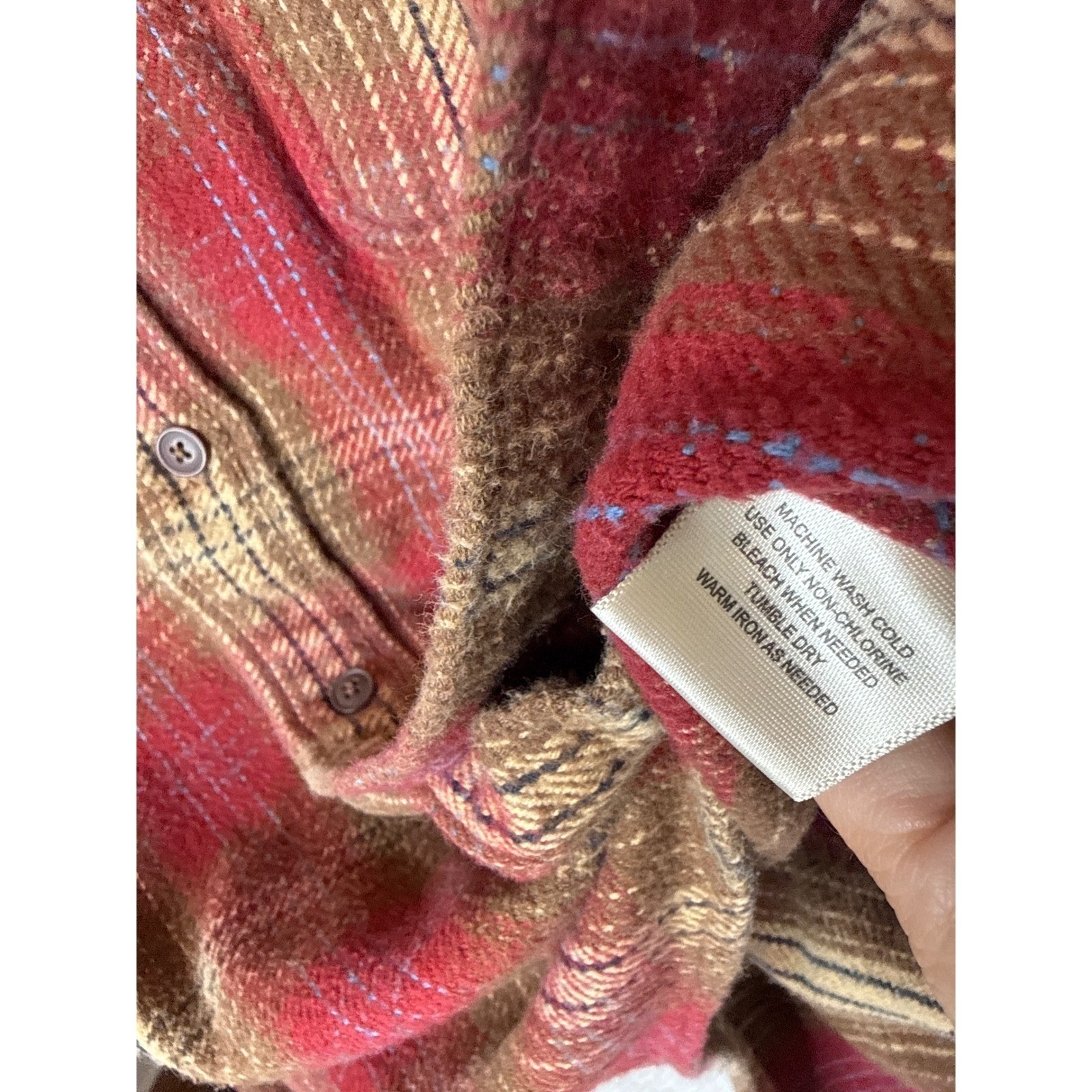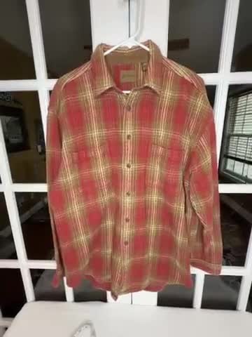 Cozy flannel shirt, perfect for adding a touch of rugged style to any outfit. This long-sleeved button-down features a classic plaid pattern in red, brown, and cream. It is constructed with two front pockets, a corduroy-lined collar, and durable stitching. This piece is ideal for casual weekends, camping trips, or layering during cooler months. Measurements: • Length: 31 inches (measured from shoulder to hem) Keywords: flannel shirt, plaid shirt, mens shirt, long sleeve, button down, casual shirt, st johns bay, large, red brown, outerwear, vintage, retro, comfort, cozy