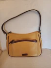 St. John's Bay Mustard Yellow Medium Shoulder Bag Purse Pre-owned. Nice purse in mustard yellow and trimmed in brown faux leather...Perfect for Fall! Front zippered pocket, front St. John's label in brown faux leather, inside zippered pocket, and brown faux leather zipper pulls. Mustard yellow fabric lining. Purse is made of 100% polyurethane and lining is 100% Polyester. Bag measures 13" wide, 9.5" tall not including handles, 9.5" deep, 3" across bottom of bag, and strap drop 10.5" All measurements are approximate. Very good like new condition.