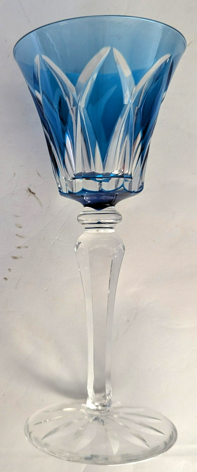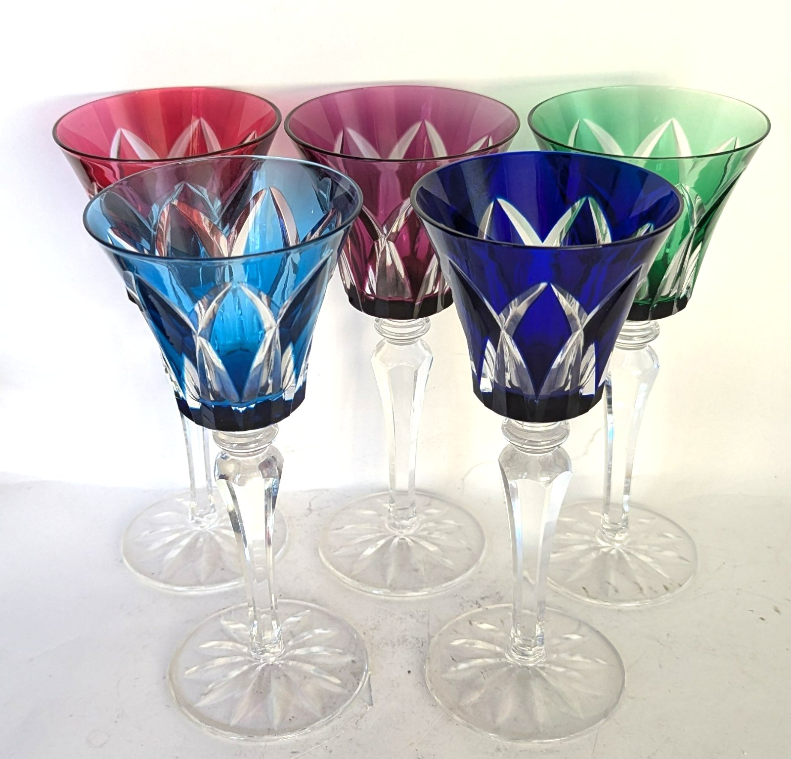 This product is a set of five St. Louis Crystal Cut Glass Wine Hocks Goblets in the Camargue design. Each goblet is stands at 8 inches tall. Made in France, these vintage pieces feature a glossy finish and are recommended to be hand washed only. No chips cracks or other damage noted. Etched circle mark has St Louis Crystal France. Very difficult to find with the bare eye. But it is there! Quality stands true!