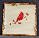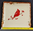 The St. Nicholas Square SNOW VALLEY 8.75" Square Salad Plate features an embossed red cardinal design, making it perfect for Christmas, holiday, or all occasion use. This contemporary salad plate is made of durable stoneware and is dishwasher safe for easy cleaning. With a glossy finish and a square shape, this plate adds a festive touch to any table setting, showcasing a multicolor bird-themed pattern that adds a touch of charm to your dining experience.