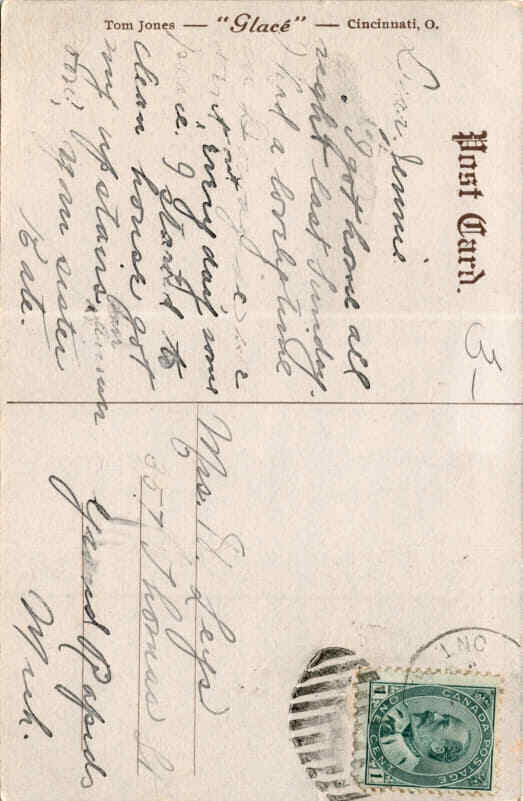 MAKE AN OFFER. THE MORE YOU BUY THE BETTER DEAL I WILL ACCEPT The postcard mentions St. Peter's Church in Niagara Falls, NY, and Cincinnati, OH. The sender, Mrs. M. Leys from Grand Rapids, MI, writes to Jennie about getting home safely and having a lovely time. There is a mention of cleaning the house and spending time with family. The postcard also features the word Glacé.