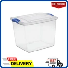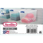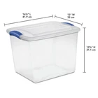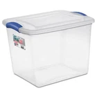 Stackable Plastic Tote Box Storage Containers Bin 27 Qt, Blue Latches Description The Sterilite 27-quart Latch Box is ideal for safely storing a variety of items. It features secure latches that keep the lid attached to the base, and the clear base and lid allow contents to be easily identified from any angle. This latch box fits conveniently on 16" wire closet shelving, making it ideal for organizing and storing sweaters, T-shirts, large craft items, books and more. The contemporary styling and shape provide solutions in many rooms of your home, office or classroom. Use it to store hats, gloves and scarves, photos or collectibles, shoes, blankets, toys and anything else you need put away. This Sterilite Quart Latch Box is versatile and handy, allowing you to easily see your contents so you never have to worry about finding what you need when you need it. Size: 16-1/2"L x 13"W x 12-1/4"H Clear lid and base for easy identification of the contents from any angle Contemporary styling and shape to provide solutions to a variety of household storage needs Colorful latches secure the lid to the base, keeping contents safely stored inside Indexed lids allow for storage boxes to stack neatly on one another Sterilite latch box, 2 pieces DOES NOT SHIP NY
