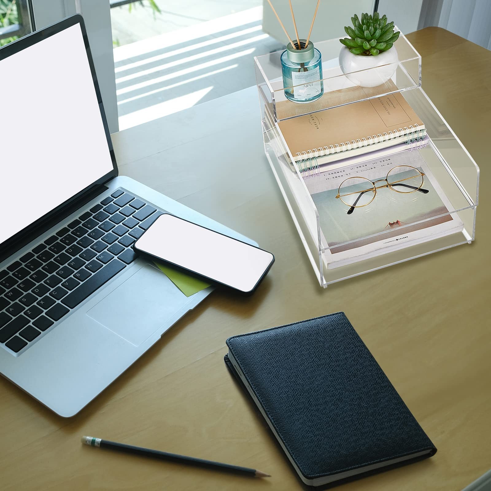 Features: Kind to share: Office tray for desk organizer can be considered as a practical gift for your family, friends, colleagues, classmates or teachers, helping them organize their desktops, they will be thankful for your warm sharing. Widely applied: The stackable desk organizer is widely applied for your daily work or study, befitting for home, office, school and library, keeping your desk organized and orderly, helping you easily find your documents and items. Specifications: Material: acrylic Color: transparent Lower layer size: approx. 30.5 x 23.5 x 7 cm/ 12 x 9.25 x 2.76 inches, 4 mm/ 0.16 inch in thickness Top layer size: approx. 23.5 x 10 x 5.5 cm/ 9.25 x 3.94 x 2.17 inches, 3 mm/ 0.12 inch in thickness Package includes: 1 Set stackable desk organizer (3 tiers) Notes: Manual measurement, please allow slight errors on size. The color may exist a slight difference due to different screen displays. Size Details: the acrylic paper tray measure approx. 30.5 x 23.5 x 7 cm/ 12 x 9.25 x 2.76 inches, with a thickness of 4 mm/ 0.16 inch; The size of the top layer is approx. 23.5 x 10 x 5.5 cm/ 9.25 x 3.94 x 2.17 inches, 3 mm/ 0.12 inch in thickness, portable and lightweight, the right size makes it suitable for storing your files and documents, the acrylic file organizer will be your ideal accessory in your workplace; Please check the size before ordering 3 Layers Organizer: the paper tray stackable features 3 layers and functional partitions according to the actual situation, the lower tray is for storing documents and the top tray is for storing small items, which can be applied to display your items and paper files, such as A4 letters, stationery, keys, jewelry, documents, books, notebooks, notepads and so on, bringing you much convenience Sturdy and Long Lasting: acrylic desk organizer is made of quality acrylic material, with high transparency, exquisite in craftsmanship, smooth in surface, sturdy and reliable to use, can serve you for a long time, so you can buy it with confidence Stackable Design: the 3 tiers desk file organizer is stackable, so you can apply it as individual tray or stack them together, no need to assemble, which can be stored on your table without taking up too much space, reducing the chaos in your office and giving you a clean working surrounding, a good helper to organize your desktop Clear Acrylic: the clear desk organizer adopts transparent acrylic material, makes it easy for you to see the contents clearly and visually, saving you a lot of time when you have an emergency meeting and keeping you out of the hassle of finding things