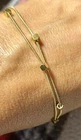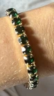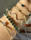 Add a touch of bohemian beauty to your outfit with this stackable set of 35 bangle and clasp bracelets. The gold-toned rhinestone bracelets feature round shape with a lobster closure and prong setting style. The charm type is a bead and the main stone is a rhinestone with a width of 5mm from largest to very small rhinestones. The bracelets are perfect for daily or nightwear and come in varied chain types. These bracelets are perfect for anyone who loves fashion and costumes. They are not antique or vintage, but they are current and stylish. The set includes bracelets from China and is not handmade. The beauty of these bracelets is in their design and the unique way they stack together. The snake clasp is 9.5”, 8” square bead 8”, and green round 10” adjustable clasps. Elastic green gem and silver rhinestone solitaire 2.5” diameter. 30 bangles almost 3” diameter.