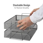 Stackable Desktop Organizer Optimize your workspace with this two-tier, stackable desktop organizer. Specifically designed to accommodate letter-size papers, folders, and files, this organizer allows you to keep your important documents within easy reach. The two separate organizers can be stacked together or placed in different areas of your desk, offering flexible storage solutions. Weighing a combined 1.76 pounds (0.8 kg), each component is lightweight and highly portable. This organizer isn't just limited to paperwork - it can also hold other office essentials like pencils, scissors, and rulers, helping keep your work area tidy. Beyond the office, it can also be utilized in the kitchen or other spaces at home, providing a practical storage solution wherever it's needed. The mesh design offers visibility, allowing you to quickly identify and grab what you need. The sturdy mesh metal design is built to withstand daily use, and its neutral color ensures it blends seamlessly into any environment. Pair it with other pieces from the Network Collection to create a cohesive storage system. As a practical and stylish organizer, it makes a great gift for coworkers, graduates, new homeowners, or anyone looking to declutter their workspace.