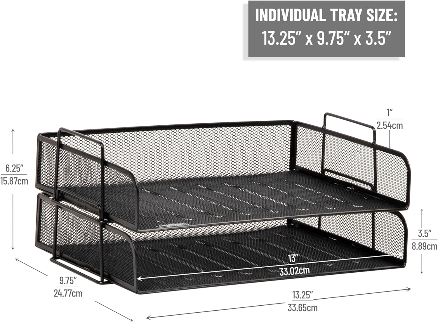 Sleek & Functional Design: Metal mesh trays hold letter-size documents and enhance organization in any workspace No Assembly Required: Arrives ready to use—stack vertically or separate across different workspaces Compact & Versatile: Great for organizing paperwork, folders, schoolwork, or incoming mail at home or office Durable & Easy to Maintain: Steel mesh construction resists wear and cleans easily with mild soap and water Space-Saving Size: Each tray measures 13.25"L x 9.75"W x 2.75"H; total stacked height is 5.5" (33.65 x 24.77 x 13.97 cm) Streamline your workspace with the Mind Reader 2-Tier Stackable Paper Tray—an efficient desktop organizer for letter-size documents, folders, and mail. These metal mesh trays help reduce clutter and promote productivity, whether used together as stackable letter trays or individually in separate areas of your office or home. Crafted from durable steel mesh, each tray offers visibility, strength, and easy access to contents. The open mesh design helps you quickly identify what you need while keeping your papers neat and accessible. No assembly is required—just unpack and organize. Ideal for anyone needing file trays for desk stackable storage, these trays are perfect for offices, classrooms, dorms, and home workstations.