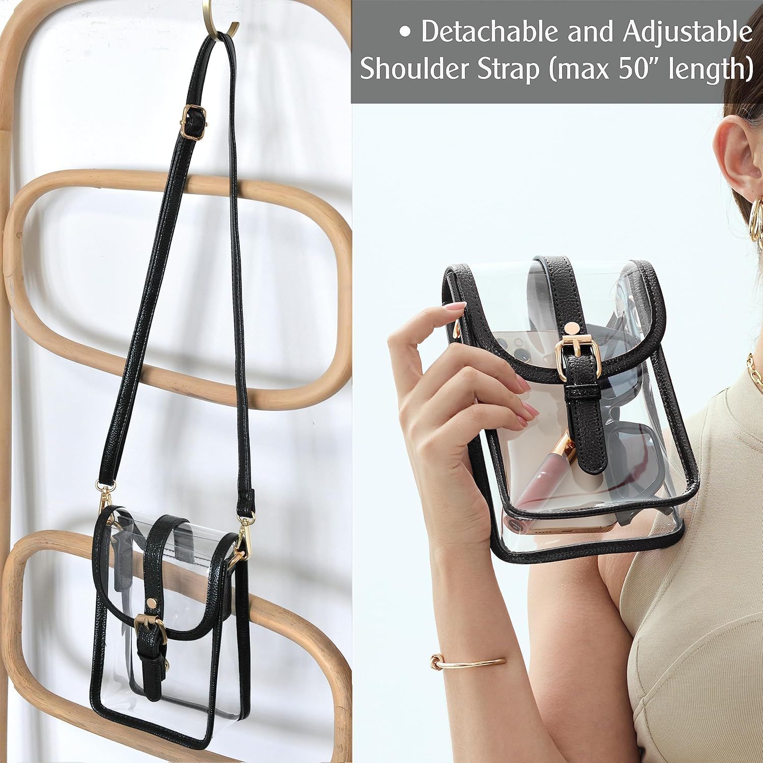 This clear PVC saddle crossbody bag is a stylish and practical choice! The slim profile and vegan leather trim give it a modern edge, while the transparent design makes it perfect for stadiums or concerts. Lightweight yet durable, it fits essentials like your phone and small items easily. The chain shoulder strap adds a chic touch. Great quality at an affordable price—highly recommend for a trendy, functional accessory!