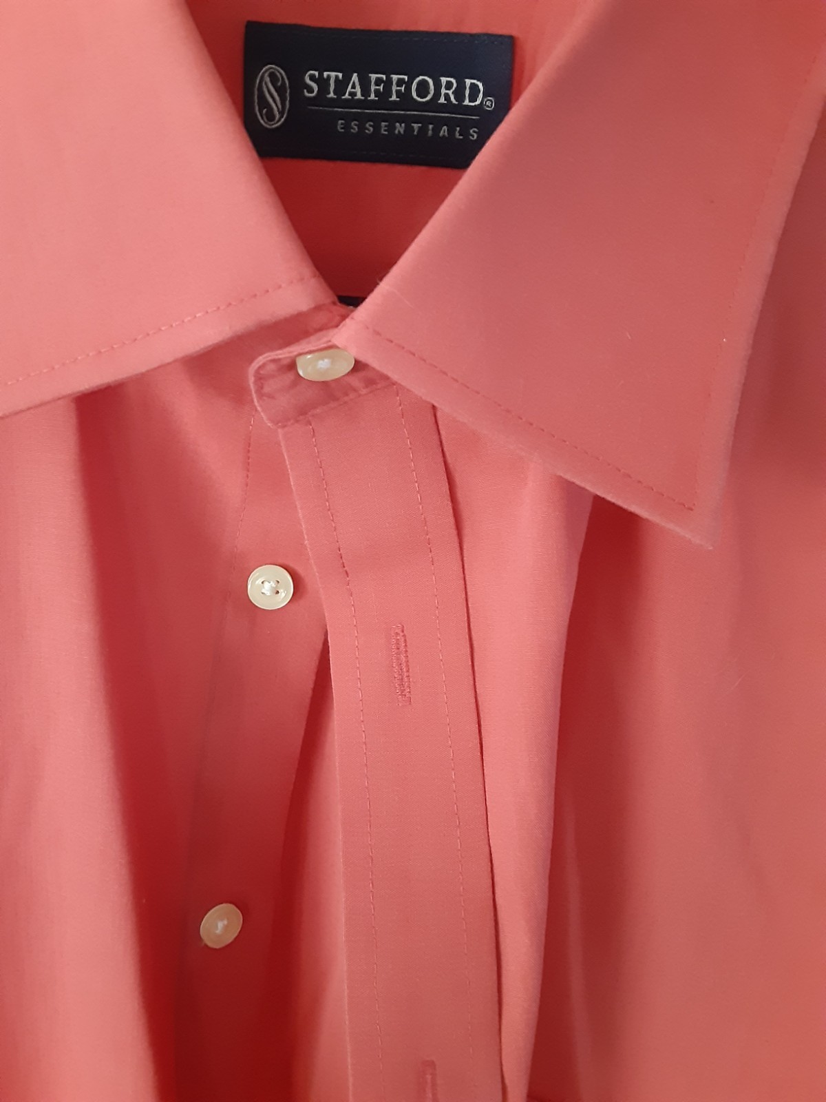 The Stafford Essentials Large dress shirt is a classic and stylish option for men looking for a sophisticated wardrobe staple. Made from a blend of polyester and cotton, this shirt offers a comfortable and durable feel. The salmon color and collared neckline with a button closure give it a polished and timeless look. With a regular fit and a 32/33 sleeve length, this shirt is perfect for any man's dress shirt collection, especially with its brand reputation and quality construction. The 17-inch neck size ensures a proper fit for a smart and tailored appearance.