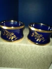 This pair of napkin rings are cobalt blue enameling over metal (battersea type). There are no scratches or dents on them and make a beautiful table setting for a couple who enjoys nice things. Thanks for looking.