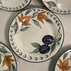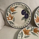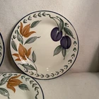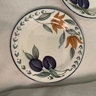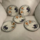 This vintage set of Staffordshire England dessert plates features a charming Plums & Flower pattern on bone china. Made in the 1980s, the five-piece set includes round 7" plates suitable for all occasions. With a mid-century modern style and decorative features, these multicolored plates showcase a lovely floral theme that adds elegance to any dining setting. Perfect for collectors or those looking to add a touch of vintage flair to their tableware collection, these Staffordshire plates are a delightful addition to any home. Excellent condition. No chips or cracks. One plate has a small area near the rim which is missing the glaze. This was done during the manufacturing process.