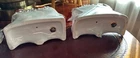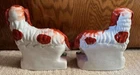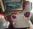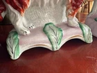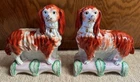 Staffordshire Victorian figure pair of spaniel dogs known as Grace and Majesty. The figures are modelled standing on green and pink plinth bases. This pair of spaniel dogs are one of the rarest canine figures produced by the Staffordshire potteries. Grace and Majesty are often seen as the top quality pair in a collection of Staffordshire pottery dogs, hence the name Grace and Majesty. Both have authenticity stickers on bottoms from antique dealer in New York. Measurements: each measures approx. 7.75" tall x 7" long. Condition: Very Good Condition, no large chips, usual crazing from age, a few tiny tiny areas of paint loss to the top of the heads and here and there (see pictures)