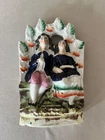 Staffordshire figures of man and woman on bench, 6" x 4", notice missing right leaf tip