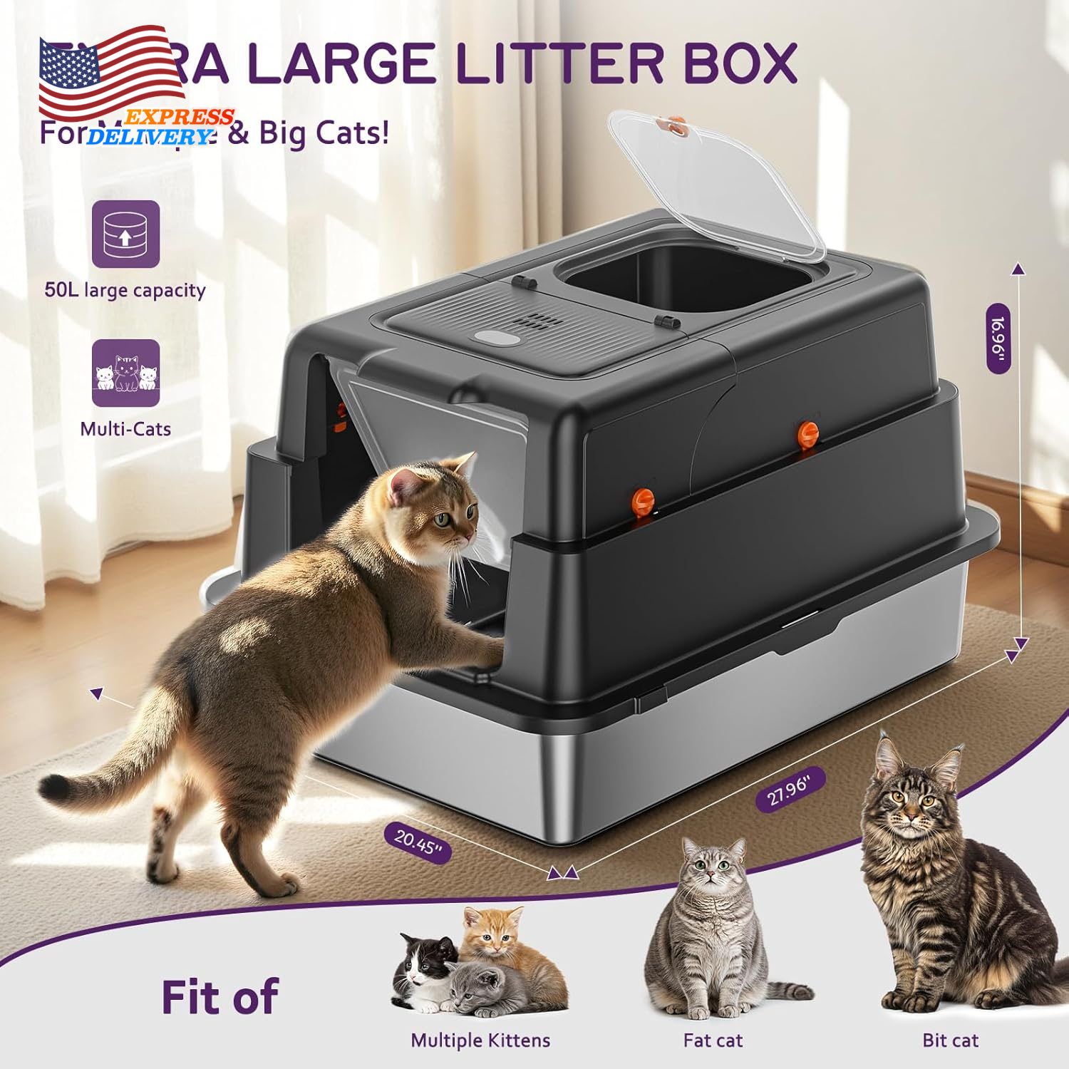 Store New Arrivals Add to Favorite View Feedback Contact Stainless Steel 28" XXXL Large Litter Box with Lid for Multiple Cats Description Item model number 000 Warranty Description 12 Month Warranty Item Dimensions LxWxH 27.9 x 20 x 17 inches Color Black Product Dimensions 27.9"L x 20"W x 17"H Material Stainless Steel Style Morden Specific Uses for Product Indoor Item Weight 12 Pounds With Lid Yes Number of Items 1 Target Audience Keyword house-cats Model Name 000 Size XX-Large Litter Box Type Covered Litter Box Item Package Dimensions L x W x H 28.6 x 21.4 x 7.8 inches Included Components 1* Cat little box 【PREMIUM STAINLESS STEEL LITTER BOX】 YIZEFERN's metal litter box with lid features a premium stainless steel interior. Its non-porous, smooth surface resists stains and odors permanently, eliminating the bacteria and stubborn smells that plague scratched plastic boxes. Cleaning is effortless—just wipe it clean in seconds. This stainless steel litter box with lid is the ultimate, permanent solution for a sanitary cat litter box enclosure 【DUAL-ACCESS COVERED LITTER BOX】 YIZEFERN's covered litter box boasts an exclusive 135° wide-open top lid. You never need to remove the entire top for scooping or refilling, making daily maintenance incredibly easy and hassle-free. This innovative covered cat litter box design significantly upgrades your routine. It offers flexible entry options, functioning as both a top-entry or front-entry litter box enclosure to suit your cat's preference 【SPACIOUS XXXL DESIGN FOR LARGE CAT】 As a superior cat litter box covered, its sealed structure powerfully contains odors inside. Internal urine guards prevent side leaks, even from standing sprays. Both front and top doors feature secure locks, preventing accidental openings and escape attempts, ensuring safety and peace of mind. This large litter box enclosure is the perfect barrier for protecting your home 【HIGH SIDED DESIGN PREVENTS LEAKS & SCATTER】 As a superior cat litter box enclosure, its sealed structure powerfully contains odors inside. Internal urine guards prevent side leaks, even from standing sprays. Both front and top doors feature secure locks, preventing accidental openings and escape attempts, ensuring safety and peace of mind. This large litter box enclosure is the perfect barrier for protecting your home 【NON-SLIP PADS FOR ULTIMATE STABILITY & SAFETY】 We include complimentary non-slip pads for this high sided stainless steel litter box. Apply them to the bottom of the base and the filter mat to significantly increase grip on your floor. This prevents the stainless steel litter box with lid from sliding during energetic digging or entry/exit, ensuring complete stability. It provides a secure and comfortable covered cat litter box experience for your pet. Product description The video showcases the product in use. The video guides you through product setup. The video compares multiple products. The video shows the product being unpacked. Enclosed Stainless Steel Litter Box with Lid Merchant Video ABOUT US We offer the best prices around on high quality products. Our E-store includes media such as books, movies, music and games while offering electronics, toys, sporting apparel, clothing, tools, general home, garden items and more. SHIPPING We are always working hard to ensure your package arrives as soon as possible. Please understand that some factors like weather, high postal traffic, and the performance of shipping companies are outside of our control. We offer free shipping to the lower 48 states and ship within 2 business days of payment, usually sooner. We do not accept P.O. Boxes. Please provide a physical address. For shipping outside of the continental USA, we only use eBay's Global Shipping Program.The item is shipped to KY and then sent to the rest of the world. International customers are responsible for all duties and taxes. Continue to check out in order to calculate costs for shipping the item to your country. Messages regarding eBay's Global Shipping Program MUST be directed at eBay EXCLUSIVELY. RETURNS We offer a 30-Day Return Policy on items which you are not completely satisfied with. You have the option for a full-refund or an exchange of the item. No returns are available on items shipped outside of the USA. PAYMENT We accept PayPal. CONTACT US This page content is yet to come Please ad us to your favorite seller and visit again later Thank You CUSTOMER SATISFACTION We try our very best to make sure every customer is completely satisfied. If there's a problem, message us! We're happy to help. WE ACCEPT Copyright © 2021 AutoDS. | All Rights Reserved
