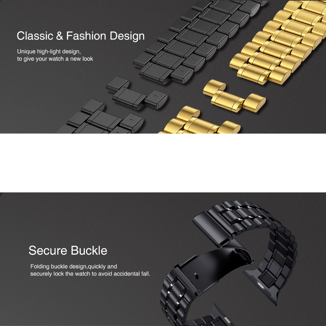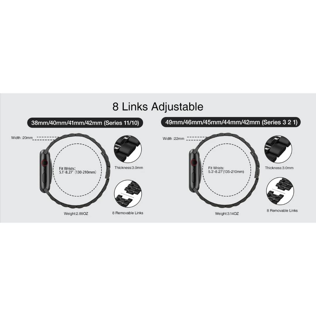 ⌚ Stainless Steel Band Strap for Apple Watch Ultra & Series (38–49mm) Upgrade your Apple Watch with this premium stainless steel band strap , designed for durability, comfort, and timeless style. Crafted with precision links and a secure clasp, this band offers a luxury metal finish perfect for daily wear, business, or special occasions. 📱 Compatibility: ✔ Apple Watch Ultra 3 / Ultra 2 / Ultra – 49mm ✔ Apple Watch Series 11 / 10 – 42mm / 46mm ✔ Apple Watch Series 9 / 8 / 7 – 41mm / 45mm ✔ Apple Watch Series 6 / 5 / SE – 40mm / 44mm ✔ Apple Watch Series 3 / 2 / 1 – 38mm / 42mm ⚠️ Note: Apple Watch not included. 🧰 Tool kit is only available to purchase with a band. 📏 Band Size & Fit: Band Width: ▪ 38/40/41mm (42mm for Series 10/11) → 20mm ▪ 42/44/45/46/49mm → 22mm Wrist Fit: 5.1" – 8.27" (130mm – 210mm) – easily adjustable for a perfect fit 💎 Key Features: ✅ Premium Stainless Steel Construction – Strong, corrosion-resistant, and elegant ✅ Adjustable Link Design – Custom fit with included resizing tool (if purchased) ✅ Secure Clasp Lock – Keeps your watch firmly in place ✅ Polished Finish – Adds a sleek, professional look to your Apple Watch ✅ Comfortable for All-Day Wear – Smooth edges and breathable design ✅ Perfect for Men & Women – Unisex modern design 🚚 USA Shipping: ✔ Delivery within 10 days , regardless of location ✔ Shipped via USPS + trusted shipping partners 💡 Why You’ll Love It: This stainless steel Apple Watch band blends luxury and practicality — perfect for any setting, from workouts to workdays. A durable, high-end upgrade that enhances your Apple Watch’s premium feel.