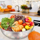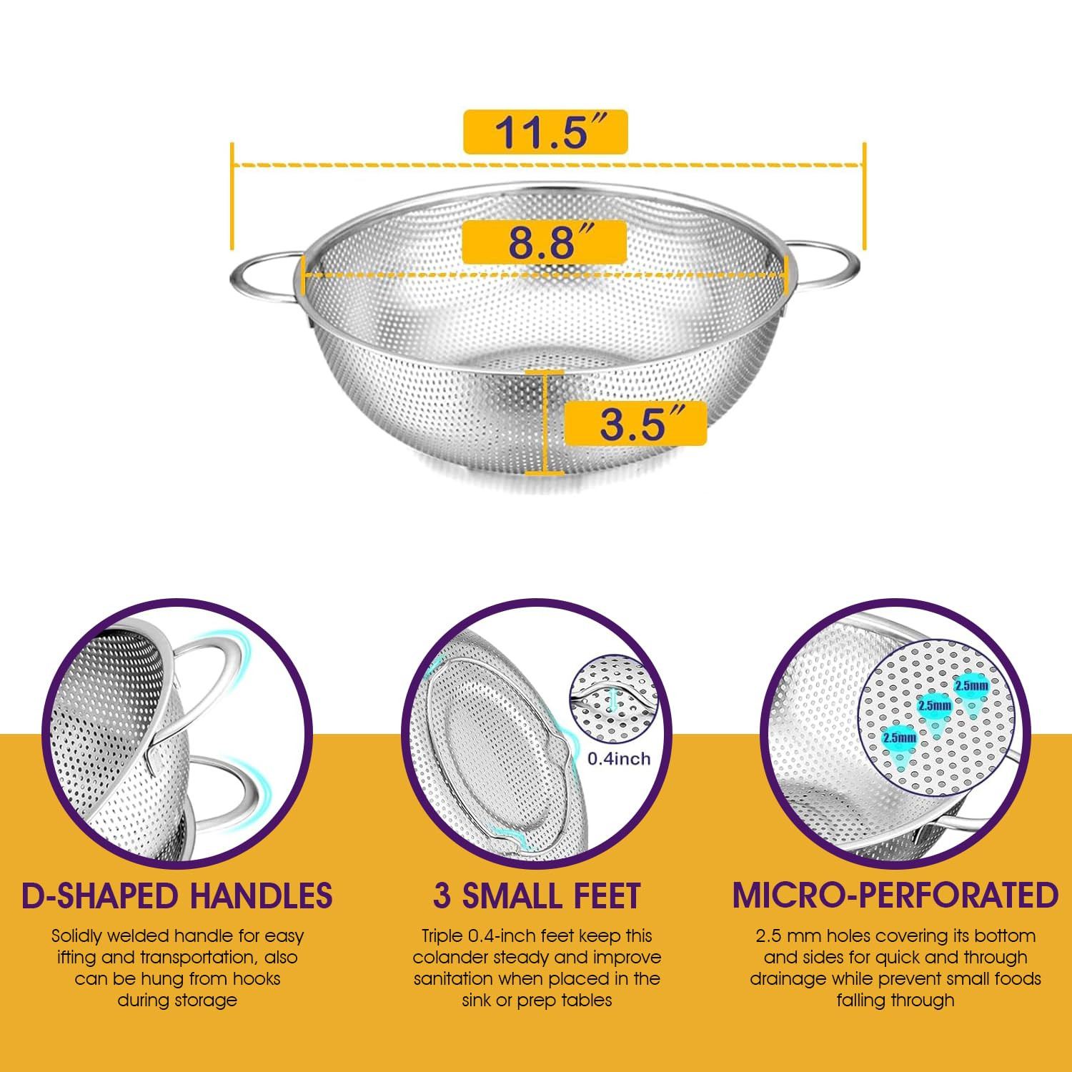 [Design] Small and compact screen, strong screen, even under heavy objects will not be bent, stretched or stuck (especially the pasta will not fall out of the screen), foot design, easy water quick discharge, strong one-piece base, prevent the screen from tipping over. 【USING】It can get rid from the frill water and oils of your pasta in a few seconds or clean your potatoes, tomatoes, berries, and every other vegetable and fruit effortlessly. We can use it in family gatherings, outings, and picnics, also a perfect idea kitchen decorations. 【MATERIAL】Made of professional-grade 18/10, 304 stainless steel, it is rust and will never affect the taste of your food! 【DIMENSION】The maximum diameter of the colander is 8.8", the longest length including the handle is 11", and the whole height is 3.9". The 3-quart capacity makes this attractive even for small restaurants and food trucks. 【AFTER SALE SERVICE】We are committed to providing each customer with the highest standard of customer service and top-quality goods, if you are not satisfied with our product or service for any reason, please contact us and we will provide the best solution for every dear customer!