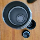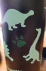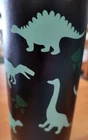 Stainless steel Dinosaur Water Bottle 16 ounces, push button top and cup. 2.36" diameter 10.25" tall, 500 ml capacity. Durable double stainless steel interior keeps contents at temperature for longer. Cowhide exterior (black), with printed dinosaur graphics (solid color - light green). Comes with a leak proof, insulated, BPA-free cap, which doubles as a small cup. Never used, came as a gift, without packaging.