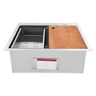 Kitchen Sink Drop-in Bar Sink Stainless Steel Topmount Kitchen Sink 23 x 22 Inch Description Made of high-quality 304 stainless steel, this kitchen sink is exquisitely crafted, wear- resistant , and corrosion- resistant . Its enlarged and deepened sink not only alleviates the splashing problem but also increases space utilization for cleaning numerous cookwares. The design with a cutting board, bottom rinse grid, roll-up dish drying rack and drainage frame allows you to wash and cut fruits and vegetables simultaneously, with which you can enjoy a more convenient life. Key Features Strong and Durable: Made of premium 304 stainless steel through the brushed process, it is corrosion and heat- resistant and will remain as good as new for a long time, even in the face of frequent daily use and all kinds of kitchen utensils collision. Space Optimization: The workstation sink is designed to hold the cutting board and drainage frame on a single track, maximizing the available space on the countertop. Large Capacity: Its large size ( 23*22in ) allows you to clean large amounts of plates, dishes, and pots, and wash fruits, and vegetables at one time without splashing, saving time. Life Assistant: This sink with a cutting board, bottom rinse grid, roll-up dish drying rack and drainage frame cleverly combines washing and meal preparation functions, allowing you to enjoy a convenient life. Invisible and Beautiful: It supports three mount types: top mount, flush mount, and under mount, which will not affect the aesthetics when the sink is flush with the countertop, and the smooth lines and low-key silver-colored appearance can also add a touch of simplicity and elegance to the kitchen. Hassle-free Cleaning: The brushed surface is not easy to leave marks, you can remove surface dust and grease by wiping with a damp cloth and detergent (not included). User Friendly: The rubber mute mat can effectively reduce the noise generated by the faucet water release and the collision of dishes, creating a quiet kitchen environment. The anti-condensation coating effectively prevents excessive temperature differences and protects the cabinet from moisture. Rapid Drainage: The X-shaped water guidelines and enlarged 3.5-inch drain hole help drain water quickly. The equipped drainage frame also ensures that the kitchen is dry and hygienic. Customer Service: We aim to provide quality products and services. If you have any problems, please feel free to contact us. We will reply to you and solve the problem for you as soon as possible. Details Rounded Corners: They are not easy to leave hygiene blind spots, making it convenient for you to clean the sink. Bottom Rinse Grid: With protective covers, it can prevent scratches on the kitchen utensils and sink. Utensils can be placed on the rinse grid for fast drainage. Roll-up Dish Drying Rack: It facilitates you to quickly clean your cookware and drain the bowl quickly to prevent bacteria growth. Hanging Hole: It is convenient for you to hang the cutting board freely in your kitchen after use to keep it dry and hygienic. Application It can be widely used in homes, restaurants, laundries, basements, bars, kitchens, food trucks, dessert stores, coffee shops, hotels, garages, gardens, etc. for washing dishes and cutting vegetables and fruits. Specification Material: 304 Stainless Steel Color: Silver Style: Modern Process: Brushed Shape: Rectangular Mount Type: Topmount, Undermount, Flushmount Assembly Required: Yes Thickness: 100mm/0.39in Drain Hole Diameter: 8.9cm/3.5in Cutting Board Size: 45*25cm/17.7*10in Drainage Frame Size: 45*24*6cm/17.7*9.4*2.4in Product Size: 58.4*55.8*22cm/23*22*8.7in Package Size: 63*50*28cm/24.8*19.69*11.02in Gross Weight: 11kg/24.25lbs Net Weight: 10.2kg/22.49lbs Package Included 1* Stainless Steel Kitchen Sink 1* Cutting Board 1* Bottom Rinse Grid 1* Strainer 1* Drainage Frame 1* Roll-up Dish Drying Rack All Accessories for Use Notes Please check the style and size before purchasing. Please do not scratch its surface with sharp objects to prolong its service life. If you want to get a better installation effect, we suggest you ask professional workers to install it. Please allow the slight color difference caused by the shooting light and 1-3cm error due to manual measurement and make sure you do not mind before ordering. Payment Delivery details Terms of sales About us Contact us Payment We accept ebay payment 。 Fees such as import duties, taxes are not included in the item price or shipping costs. These charges are the buyer's responsibility. Delivery details Shipping: 2-9 working days to: USA Terms of sales We maintain high standards of excellence and strive for hundred percent customer satisfaction. Feedback is very important to us. We hope that you contact us immediately before you give neutral or negative feedback, so that we can address your concerns. It is impossible to address issues if we do not know about them! About us Your satis faction is our ultimate goal. We work hard to earn your trust and future business. Our certified technicians have tested each item before shipping. The unit comes with 1 year limited warranty on all manufacturing defects. a) If you receive a defective item, you may return it or ask for a discount. Please contact us within 14 days after you receive the package. b) What you returned must be intact and in its original packaging as re? u. Customer is responsible for shipping costs of the returned item. c) We will cover the cost of shipping back t with the shipping rate indicated in the registration page. We will send you a new unit or refund the full payment you paid. Thank you. Contact us Business Hour Business Hour: Monday To Friday: 8:30 AM to 5:00 PM (Beijing China time) Due to time zones, our reply to your questions may not be immediately. But within above working time, we will reply your email within 24 hours. If it's non-workdays, please kindly be patient and wait till Monday. Please contact us with ebay mes