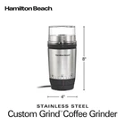 With the ® Stainless Steel Custom Grind™ Coffee Grinder, it's easy to grind just the right amount of coffee beans to the perfect grind size for your coffee, whether you need coarse ground coffee for French Press, medium grind for drip coffee or finely ground for espresso. Simply turn the patent pending adjustable selection ring to choose your grind size and cups of brewed coffee to make between 4 and 14 cups. To grind coffee hands-free, just press the top of the grinder and release. It grinds coffee while sitting stably on a countertop or table, then shuts off automatically when done. To manually control the grind size, just press the top and hold down. Release to stop grinding. The removable grinding bowl makes it easy to pour coffee into your coffee maker, and it's dishwasher safe for easy cleaning. The coffee grinder is designed for long-lasting performance with durable stainless steel grinding bowl and blades. The blades make easy work of grinding everything from coffee beans to herbs, spices and seeds. Easily grind everything from peppercorns, cumin and fennel to sesame, flax and chia seeds. Hidden cord storage underneath the electric grinder helps to reduce countertop clutter. EASILY SELECT GRIND SIZE AND CUPS OF BREWED COFFEE: Whether you need a fine grind size for espresso or a coarse grind for French press, we've got you covered. Just turn the coffee bean grinder's adjustable selection ring. Grinds enough to brew 4-14 cups. GRIND COFFEE HANDS-FREE OR MANUALLY: Convenient push-down operation allows you to activate the grinder with one press. It grinds coffee while sitting stably on the countertop and shuts off automatically. Or hold down to manually control coffee texture. EASY TO POUR & CLEAN WITH REMOVABLE BOWL: Because the bowl removes, it's easy to fill with coffee beans and to pour coffee into your coffee maker after grinding. The bowl is designed with durable stainless steel and is dishwasher safe. DURABLE STAINLESS STEEL PARTS: The electric coffee grinder has durable stainless steel grinding bowl and blades for long-lasting performance. GREAT FOR HERBS AND SPICES: With durable stainless steel blades, this coffee grinder makes easy work of grinding everything from coffee beans to herbs, spices and seeds.