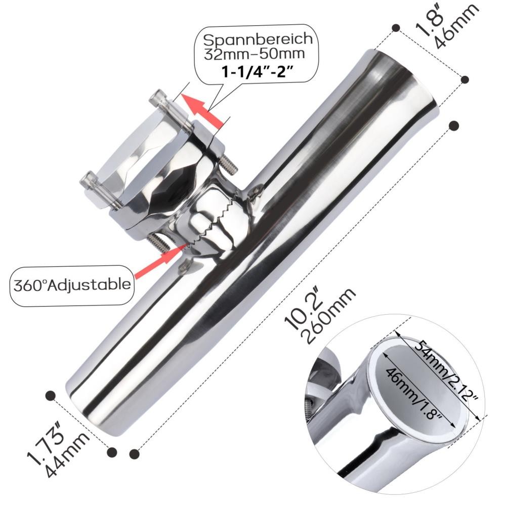 Description ▲ Specification 1.USES: BOATS & YACHTS & CAR etc. 2.Color:Silver 3.Size:L = 10" (258mm) I.D. = 1.75" (38mm) - 2"(50.8mm) - 2.2"(56mm) 4.Fits to rail:1-1/4"--2" (31mm-51mm) 5.Material:Clamp made of 316 Stainless Steel ;Tube made of 304 Stainless Steel