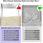 Why Choose Stainless Steel? Stainless steel is odor-resistant, anti-scratch and easy to clean Product Description Discover the Benefits of Stainless Steel Cat Litter Box! Are you tired of dealing with plastic litter boxes that collect residue and odors? Upgrade to Kirntcoy high-quality extra large stainless steel cat litter box with high sides and revolutionize your cat litter pan experience! Here's why our stainless steel litter box high wall is the ultimate choice for cat owners like you; Long Service Life: Choose stainless steel litter box with lid for a 3-5 year lifespan, no more frequent replacements. Scratch-Resistant: Kirntcoy stainless steel litter box for cats resists scratches, prevents stains from being retained. Odor-Free: Non-sticky surface and high sides prevent odor buildup. Premium Quality: Thickened stainless steel material, stronger than ordinary stainless steel litter box with lid! Easy Cleaning: Smooth surface for effortless maintenance. Stylish Design: Sleek and modern, complements any home decor. Choosing Kirntcoy stainless steel litter box with high sided, making it a smart, long-term investment despite the initial cost! Provide your furry friend with the clean, odor-free space. Say goodbye to plastic hassles and hello to a new era of litter box excellence! Now to our stainless steel cat litter box with high sides and experience the difference for yourself. Your cat will thank you for it! Package includes: 1 x cat litter box; 1 x High-Side Encloure; 1 x Cat Stand Cpoon. On May 19, 2025 at 20:15:45 PDT, seller added the following information: