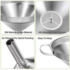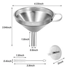 Are you tired of a messy kitchen with filtering work? Don't worry, this Stainless Steel Funnel will help you and makes it right. Durable Funnel The funnel set is made of premium 304 stainless steel material with high corrosion-resistant, no worry to clean and dishwasher safe. Protecting Hands The hanging handle is designed to protecting hands while transferring hot things, it is easy to hang on and store, saving storage space and maintaining hygiene. Groove Design Make the air flow more efficiently. Filter more smoothly than ordinary funnel and not easy to block and residue. Multipurpose You can use the funnel to fill a pepper, spice, salt, jam, particulates, powder, etc. Also, you can use the detachable strainer while filtering hot cooking oil, grease or soup, etc. Specification: Funnel Material: Food-Grade 304 Stainless Steel Strainer Material: Food-Grade 304 Stainless Steel Funnel Dimension: 4.3 inches diameter, 3.9 inches tall, 1.8 inches long stem, diameter of the spout is 0.6 inches Strainer Dimension: 2 inch diameter Package Included: 1 x Stainless Steel Funnel 1 x Small Brush 1 x Detachable Strainer 【Safe & Durable】The funnel is made of 100% Food grade 304 stainless steel with practical handle, long service life and safe for dishwasher. 【Easy to Clean and Store】With a smooth metal surface, the funnel and detachable strainer is easy to clean, hand washable and dishwasher safe. The ergonomic handle is easy to grip or hang in your kitchens, garages, or utility rooms. 【Detachable Strainer】Include a 304 stainless steel strainer, ideal for filling bottles and filtering hot cooking oil, grease or soup, etc. You can also separate the strainer and use it as a standard funnel to fill a pepper, spice, salt, jam, particulates, powder, etc. 【Quick Funnel】Heart-shaped stem air release channel allows the outflow of air in order to fill liquid faster. 【Compatible】Compatible for most bottles, jars and other containers. Perfect for transporting liquids quickly and accurately, rebottling, adding jams and marmalades to storage containers.