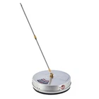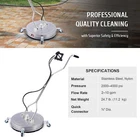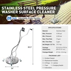 Product Detail Specifications Packing List Material: Stainless Steel, Brass Color: Silver Pressure Range: 2000-4000 psi Waterflow Rate Range: 1.8-6 GPM Washer Diameter: 20 in. Extension Wand Length: 17.5 in. Package Dimensions: 21 x 21 x 9.1 in. Net Weight: 14.3 lb. 1 x Pressure Washer 2 x Extension Wands 2 x Backup Nozzles 1 x Teflon Tape 1 x Nozzle Cleaner 4 x O-rings 1 x Instructions Features Description Features QUICK & THOROUGH: Our20" surface cleaner head for powered washers has two rotary nozzles and 4 caster wheels perfect for quick and thorough scouring of driveways, sidewalks, patios, and decks as well as large vertical surfaces like walls, garage doors, fencing, and more. TOUGH & DURABLE: This pressure washer attachment is constructed from stainless steel and premium brass, allowing it to work with pressure cleaning machines using up to 6 GPM of water under pressures as high as 4000 psi. SPLASH-FREE: The stainless steel cover is ringed with a circle of hard brushes to minimize splashback and flying debris, keeping you safe and dry as you clean. UNIVERSAL COMPATIBILITY: The 1/4-inch connections on the two included 17.5" extension wands work with most standard gas and electric-powered pressure washers to give you the widest range of choices. 2 EXTRA NOZZLES: Each nozzle features a built-in filter to protect your system from contaminants, minimizing damage and blockage in your line; 2 extra nozzles come included, along with a helpful needle tool for cleanup and maintenance at the end of the day. Description Ready to get your driveway, sidewalks, and patios spotless? Plenty of power washers come with dangerous bare wands or inferior base attachments. This surface cleaner set will get the job done right cleanly and safely every time. Blast away dirt and grime from your walkways, decks, and walls! Our 20-inch pressure washer head has two angled stainless steel and brass nozzles that rotate to work quickly and evenly on horizontal or vertical surfaces, without leaving the unsightly streaks caused by fixed wands. The stainless steel cover and its ring of protective bristles shield you from flying debris and splashback as you work. The 1/4-inch connections fit most standard gas and electric high-pressure cleaners and work with systems using water as hot as 140F under as much as 4000 psi of pressure. Using 3600 psi or less, of course, is recommended to extend the product's service life. Look to us for the best power washer attachments to keep your auto-adjacent spaces sparklingly clean!