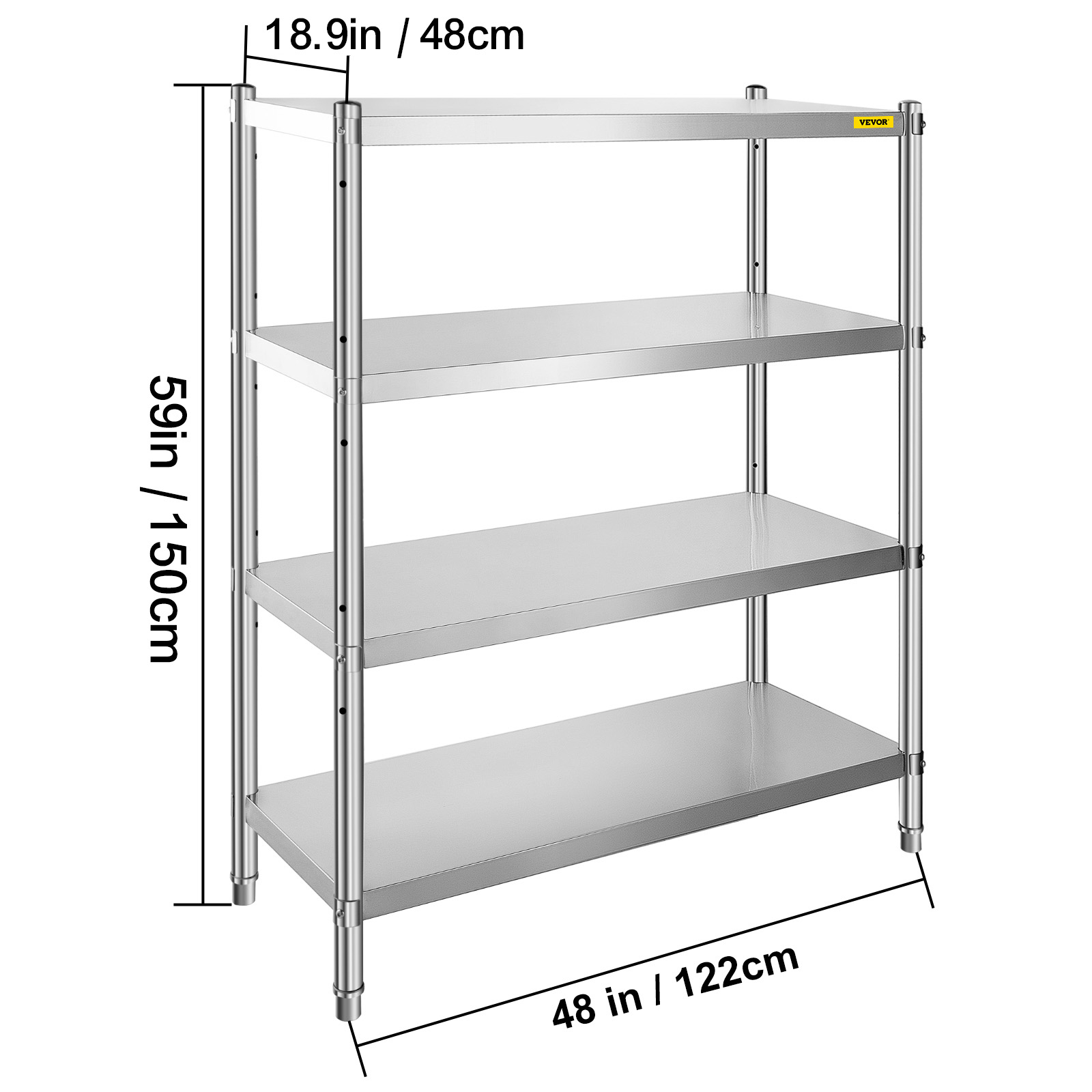 Document Product Description 4 /5- Tier Storage Shelf Stainless Steel & 132-330lbs Load Capacity of Each Shelf & Adjustable Height Our stainless steel shelf has a brushed surface. It will become a very reassuring presence, no matter you locate it in your kitchen or garage. With its 132- 330 lbs load capacity for each tier and its vast flexibility, you can organize your belongings in a better manner. Besides, it is also easy to clean without excessive ash accumulation or untimely rusting. Great Load Capacity Reliable Properties Adjustable Tier Effortless Assembly Why Choose us? Premium Tough Quality Incredibly Low Prices Fast & Secure Delivery 30-Day Free Returns 24/7 Attentive Service Key Features Heavy Duty Shelf You can store as many as 132- 330 lbs items on each tier of this storage shelf. Our 4/5 tiers storage shelf can allow you to put various objects on it, like kitchenware, tires and so on. Sturdy Stainless Steel Material This sturdy storage shelf is made of stainless steel, so there is no need to worry about excessive ash accumulation or premature rusting. Its easy cleaning also further ensures its durability. High Flexibility Shelf Adjusting the tier up or down by 2" is achievable if you want to store large items. Detaching the middle tiers to organize your things better is also feasible. Thoughtful Design With the crossbeam design at the back of every tier, the storage shelf is sturdy and stable for you to store heavy objects without the worry of deformation. The vent holes on the shelves (including Type B, D, G, I) provide better air flow for keeping the freshness of the stored food. Easy Assembly Once the product arrives, you can quickly fasten the tiers to the columns with screws. The 4 feet of our stainless steel shelf can be rotated to stand firmly on the ground. Wide Application This stainless shelf is suitable for various occasions. For example, locating it in the kitchen for kitchenware or garage for automotive service kits is available. Specifications Material: Stainless Steel Shelf Type: 4 /5 Tier Load Capacity: 132 /330 Lbs Per Shelf Column Width: 1.5 inch / 3.8 cm Tier Thickness: 1.6 inch / 4 cm Adjustable Feet Height Range: 2 inch upward, 2 inch downward Product Dimensions: 46.8-70.9 x 17.7-18.5 x 59-72 inch Product Weight: 33.1/42.3/44/50/50.7/52.5/59.5/60/66.1 lbs Package Content 1 x Stainless Steel Shelf 1 Sets of Screws and Nuts Here we provide you with 10 types of storage shelves with different sizes and tiers. Type A : 48in 4 Tiers; Type B : 48in 4 Tiers w/ Vent Holes; Type C : 60in 4 Tiers; Type D : 60in 4 Tiers w/ Vent Holes; Type E : 72in 4 Tiers; Type F : 48in 5 Tiers; Type G : 48in 5 Tiers w/ Vent Holes; Type H : 60in 5 Tiers; Type I : 60in 5 Tiers w/ Vent Holes; Type J : 72in 5 Tiers. Features & Details Great Load Capacity: Our 4 /5 tier s storage shelf, can provide you with colossal storage space. With its 132- 330 lbs load capacity for each tier, you can put kitchenware, vases and other miscellaneous items on it. Besides, its 1.5" wide columns and 1.6" thick tiers can further enhance the load-bearing. Reliable Properties: Our storage shelf unit with a brushed surface is stainless steel, ensuring perfect solidity, rust-proof, and easy-cleaning for durable use. The back of its tier adopts a crossbeam design, incredibly stabilizing the whole structure. In addition, the shelves (including Type B, D, G, I) contain vent holes for improving air flow, maintaining the freshness of your stored food. Adjustable Tier: Our storage shelf unit with 4 /5 tiers can guarantee you great flexibility. It adopts a height-adjustable design, allowing you to raise or lower it by 2" to organize your items better. If necessary, detaching the middle tiers to store larger objects is also feasible. Effortless Assembly: It is easy for you to install this shelf unit and put it into use with our attached tools. All you need is to fix the tiers and columns together with screws. The feet can hold the shelf unit well in place. They are also all adjustable so that you can adapt the shelf unit to uneven ground. Versatile Uses: This stainless steel shelf is suitable to be put anywhere for you to organize your various items. Locating it in your kitchen for kitchenware is available. Putting it in the garage to store tires or car service kits is also a good idea. Our stainless steel shelf can help you tidy up your living environment. SHIPPING ABOUT US PAYMENT RETURNS CONTACT WARRANTY Welcome to our eBay store. As a leading and emerging company in manufacturer and exporting business, we are specialized in Business and Industrial Products, Sporting Goods, Pet Products, Home and Garden products for more than 10 years. We believe that it is our vision and mission to provide innovative products with best service and competitive price to satisfy you. Our goal is to make sure that you can find exactly what you are looking for and make it easy for you to place your orders. We accept PayPal payment,PayPal Credit,Credit card or debit card and so on. Payment should be completed within 4 (Four) days of auction closing. Or unpaid dispute will be filed for closing auction. We will leave a positive feedback immediately after payment is received. We appreciate a positive feedback as much as you do. If for some reason there is any issue with the purchase, please contact us prior to leaving feedback, we will be glad to work together and provide a satisfying solution. Please be aware that PO Box cannot receive items, please DO NOT fill in the PO Box address. DELIVERY DAYS: 3-7 BUSINESS DAYS 3 BUSINESS DAYS SHIPPING OUT SHIP FROM CA & TX & NJ & GA & NC &OR WAREHOUSE California Warehouse: City of Industry, CA Texas Warehouse : Houston, TX New Jersey Warehouse : Perth Amboy, NJ New York State Warehouse: Perth Amboy, NJ Georgia Warehouse: Austell,GA North Carolina Warehouse: Grove NC Oregon Warehouse: AIRPORT WAY Portland,OR All of our items are backed with a 30-day return policy. We ensure all our items are new an