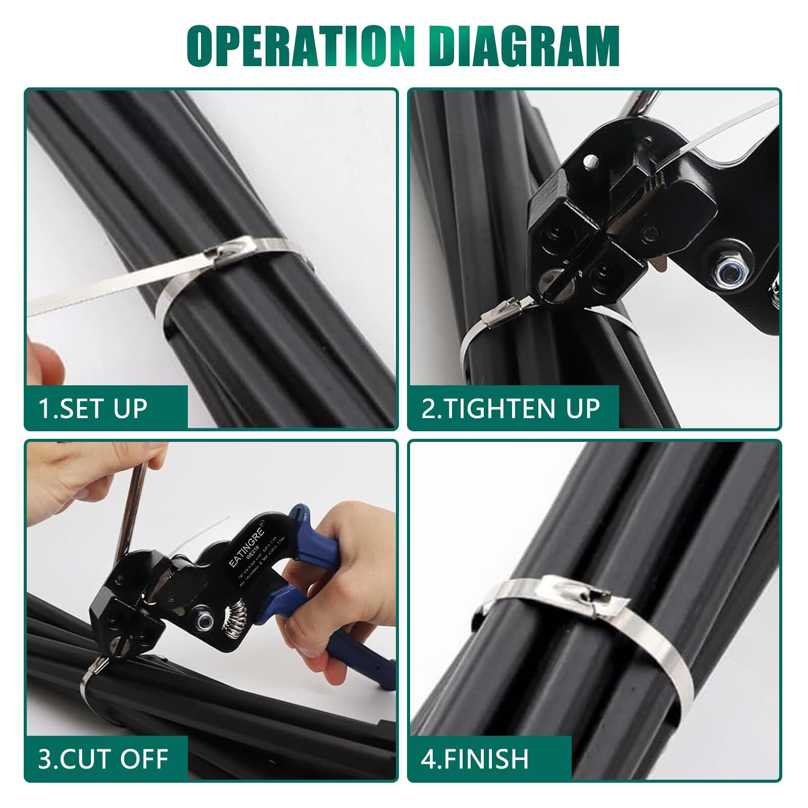 Metal Zip Ties Tool, Stainless Steel Cable Tie Gun with 200PCS Self-Locking Metal Steel Zip Ties, Metal Tie Wrap Gun Kit, Duty Outdoor Adjustable Fastening Cutting Tie Tool Sets About the Product Key Features Package Contents: Stainless steel zip tie gun; 200pcs stainless steel locking metal cable ties; Industrial Metal Scissors; Metal Cable Tie Remover; Industrial gloves; Tool Organizer; Instruction manual. 200PCS Stainless Steel Cable Tie: 4.6mm x 270mm (0.18in *10.6in). The upgraded flame retardant grade 304 stainless steel metal zip ties max supporting weight is 198 lbs. Ideal for bundling wire or hose under conditions of vibration, general weathering, radiation and extreme temperatures. High Quality Cable Tie Gun: WE210 steel cable tie gun is a well made heavy duty tool. The tie gun is made from sturdy stainless steel with a comfortable grip. Heavy duty zip tie gun is very ideal for tensioning and cutting off stainless steel cable ties with width from 4.5mm to 12 mm. You can fasten wires and components securely in place with metal zip ties. Easy To Use and Organize: The stainless steel cable tie gun kit works well to tighten stainless steel zippers, is easy to operate, cuts smoothly and can be operated with one hand. Additionally the kit includes a tool organizer bag for easy tool handling and storage. Widely Applications: Metal ties are suitable for cable routing, exhaust/roof heat wrapping, electronics engineering, automotive, home improvement, outdoor fence repair and more. Whether you're working on a building project or a rewiring project, use metal ties to hold wires and components securely in place. Delivery Information Our shipping is prompt and secure. Orders are dispatched within 1-2 business days. It should take 3-5 business days for the product to reach your destination (Saturday and Sunday excluded). We do not ship to a different address. we will ship to the address you provide on the ebay only. Please check your address before purchase. Return Policy Returns are accepted within 30 days if you are not completely satisfied. Refunds are issued back to your original payment method. Items must be returned in their original condition and packaging. Payment Options We accept PayPal, credit cards, and other payment methods supported by eBay. Please ensure your payment details are up-to-date to avoid any delays. Your Feedback Matters We appreciate your feedback. If you're happy with your purchase, please consider leaving a positive review. Contact Information If you have any queries or require further assistance, please contact us via eBay messages.