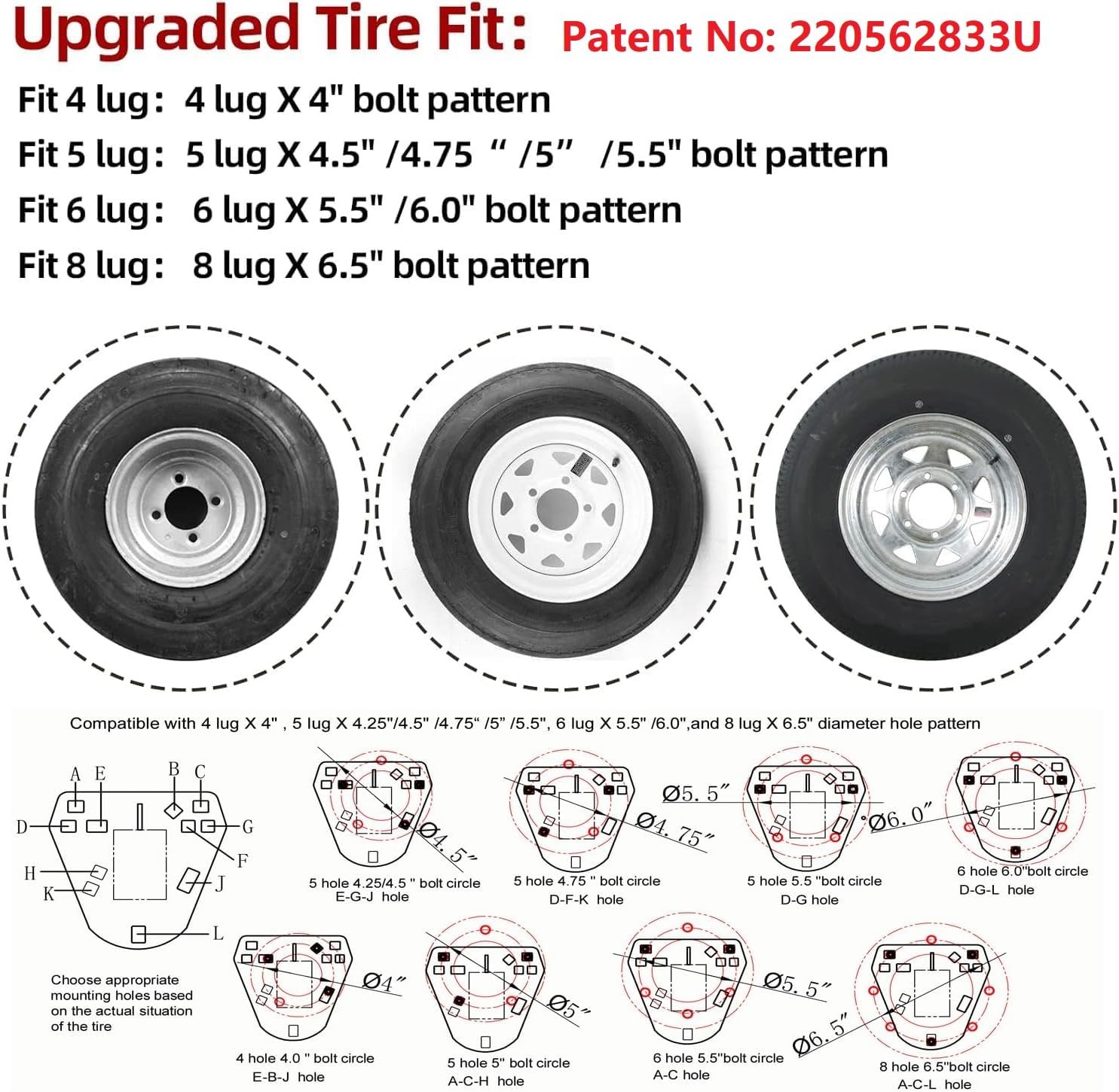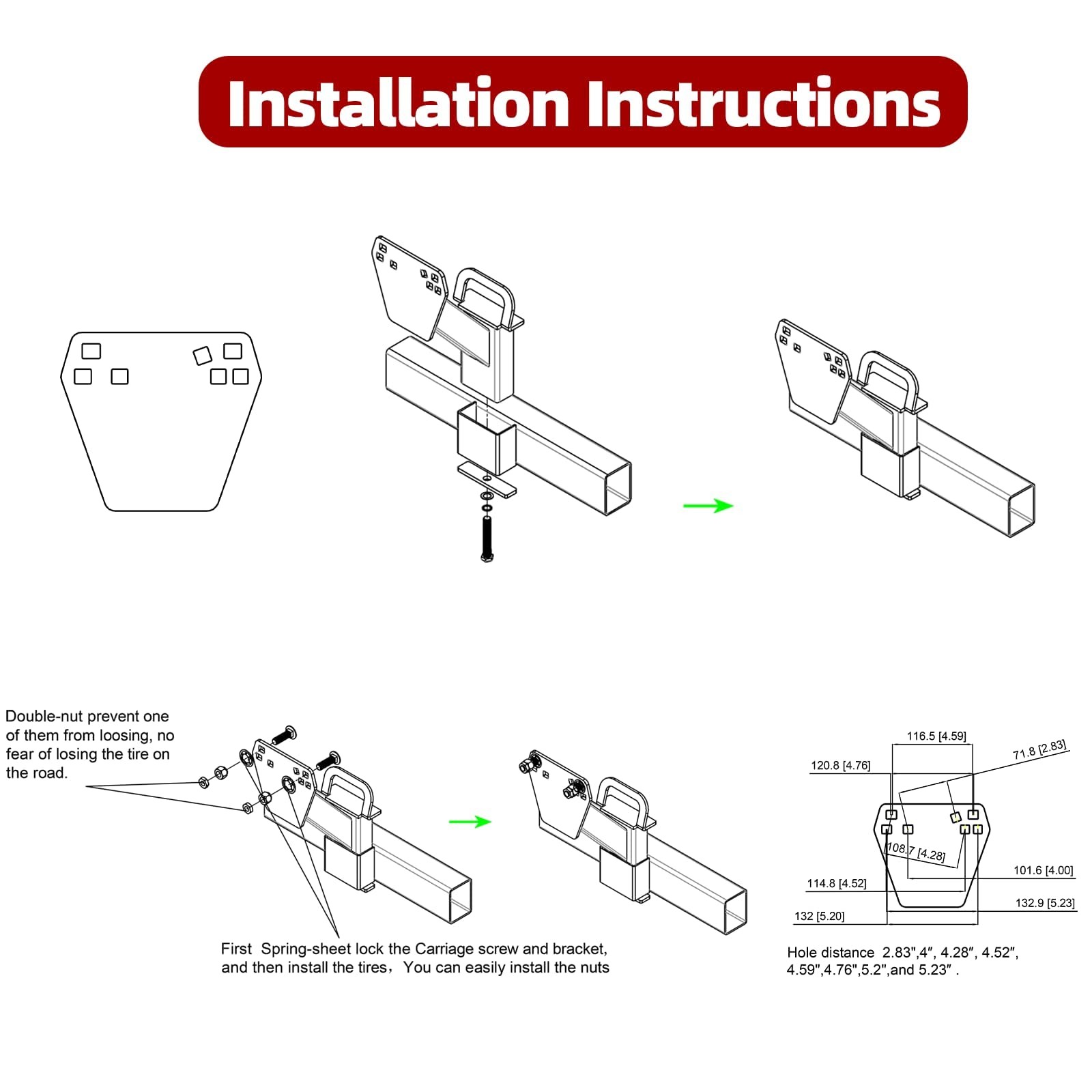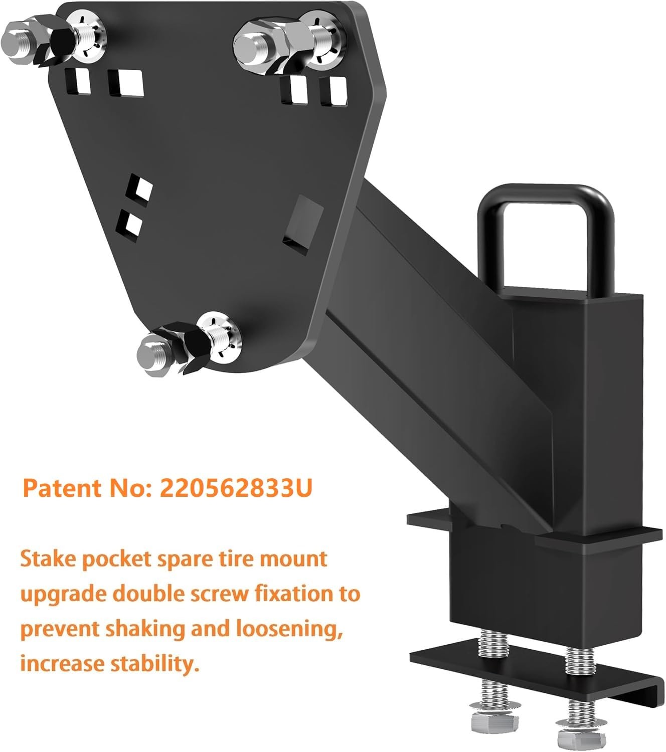 Stake pocket spare tire mount upgrade double screw fixation to prevent shaking and loosening, increase stability.Trailer spare tire mount stake pocket Fits most tongue and trailer frames Compatible with 4 Lug X 4", 5 Lug X 4.5" /4.75“ /5” /5.5", 6 Lug X 5.5" /6.0",and 8 Lug X 6.5" Diameter Hole (Patent Pending),spare tire carrier fits mounts on trailer tongues up to 4 inch wide and 2.5 to 6 inch high stake pockets.spare tire mount for utility trailer.Patent No: 220562833U 【Upgraded Stake Pocket Spare Tire Carrier Fit】: 1)Stake pocket spare tire mount upgrade double screw fixation to prevent shaking and loosening, increase stability.2) Upgraded 3 Nut design can better lock the tire, reduce the vibration and noise when driving, thus avoiding the nut loosening and tire falling.(Patent No: 220562833U). 【Universal Compatibility】:This spare tire mount for utility trailer, spare tire carrier fits mounts on trailer tongues up to 4 inch wide and 2.5 to 4 inch high stake pockets.Spare tire mount for utility trailer Trailer spare tire mount stake pocket Fits most tongue and trailer frames Compatible with 4 Lug X 4", 5 Lug X 4.5" /4.75“ /5” /5.5", 6 Lug X 5.5" /6.0",and 8 Lug X 6.5" Diameter Hole Pattern 【Safe Durable Advantage】: This Stake Pocket Spare Tire mount hold max load up to160 lbs. Durable powder coat finish to resist rust and corrosion 【Easy Installation】: First Spring-sheet lock the Carriage screw and bracket, and then install the tires,You can easily install the cone nuts fixing the tire.Double-nut design prevent one of them from loosing, no fear of losing the tire on the road 【Excellent service】: All mounting hardware and installation instructions induded.If you have any questions, you can contact us, we will help you solve it